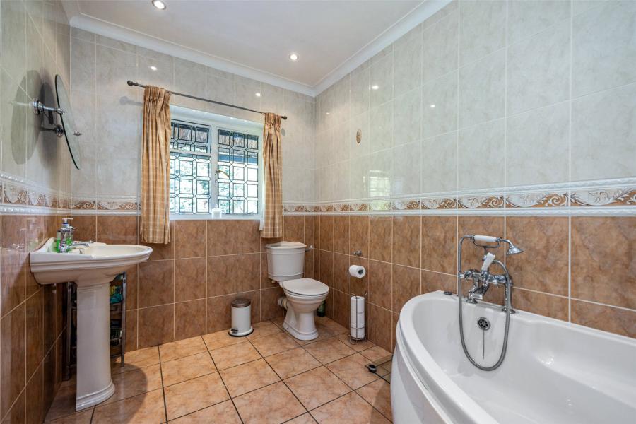 White suite comprising: Panelled corner bath with mixer taps and telephone hand shower over, pedestal wash hand basin, low flush WC, fully tiled walls, ceramic tiled floor, large towel radiator, corniced ceiling, recessed spotlighting.