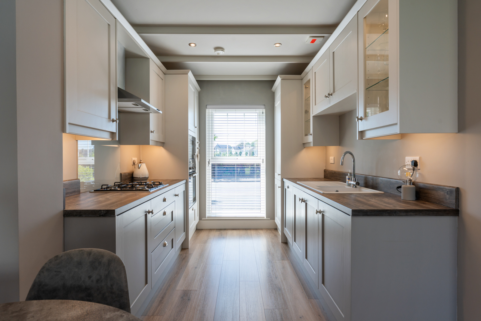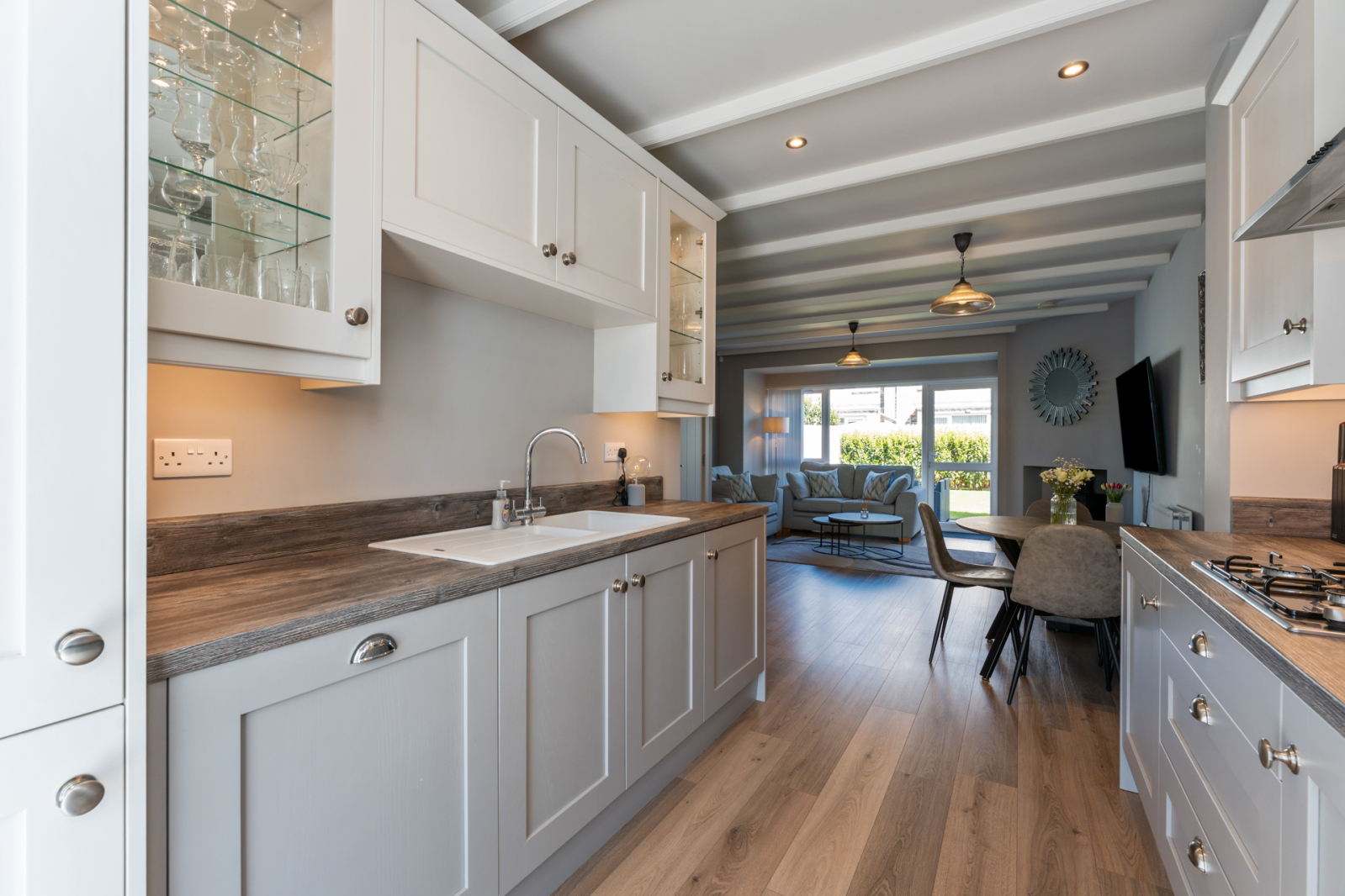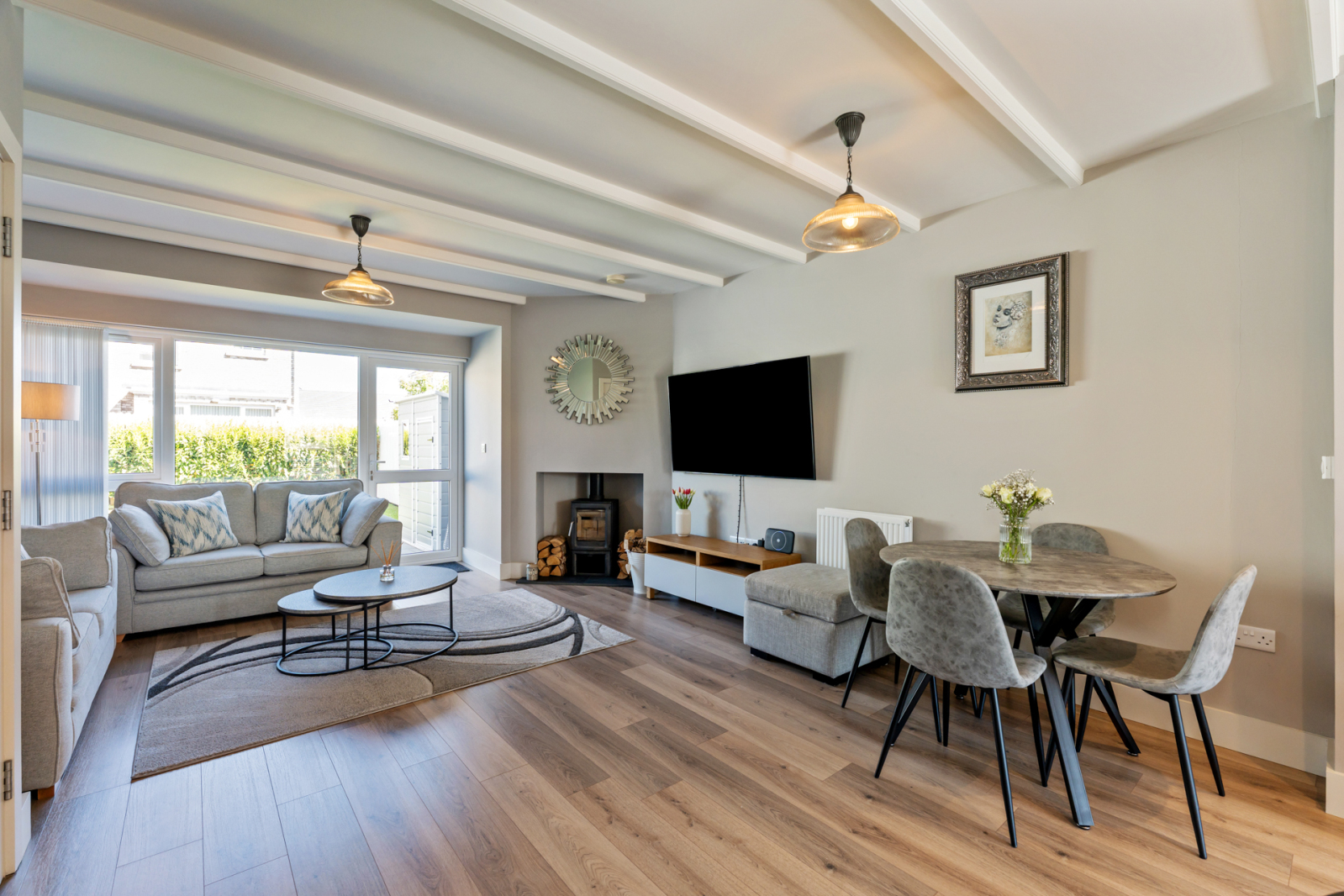 Wite 1.5 tub single drainer sink unit with mixer taps, excellent range of high and low level Cream and Cashmere shaker style units, Formica roll edge work surfaces, 4 ring ceramic hob unit, glass splashback, stainless steel extractor hood, integrated fridge freezer, built in oven, microwave and dishwasher, display cabinets, concealed lighting, polished laminate floor, dual aspect, LED recessed spotlighting, feature fireplace, wood burning stove, polished laminate floor, dual aspect, LED recessed spotlighting, feature fireplace, wood burning stove, TV and telephone points, uPVC double glazed door to rear with large window overlooking rear garden.