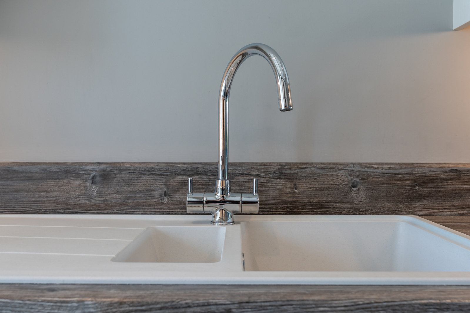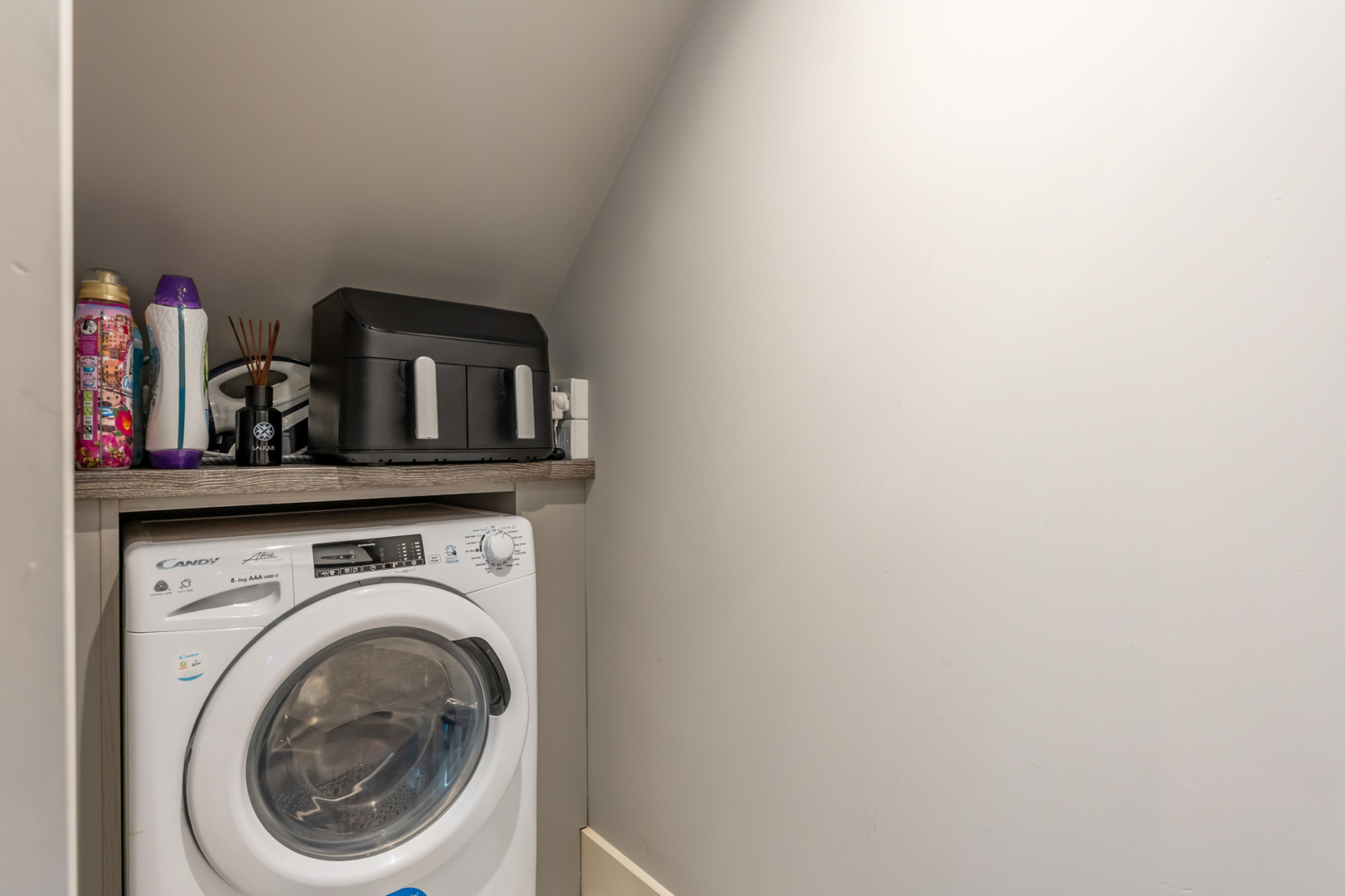 Formica roll edge work surfaces, plumbed for washing machine, gas boiler, ceramic tiled floor, extractor fan, LED recessed spotlighting.