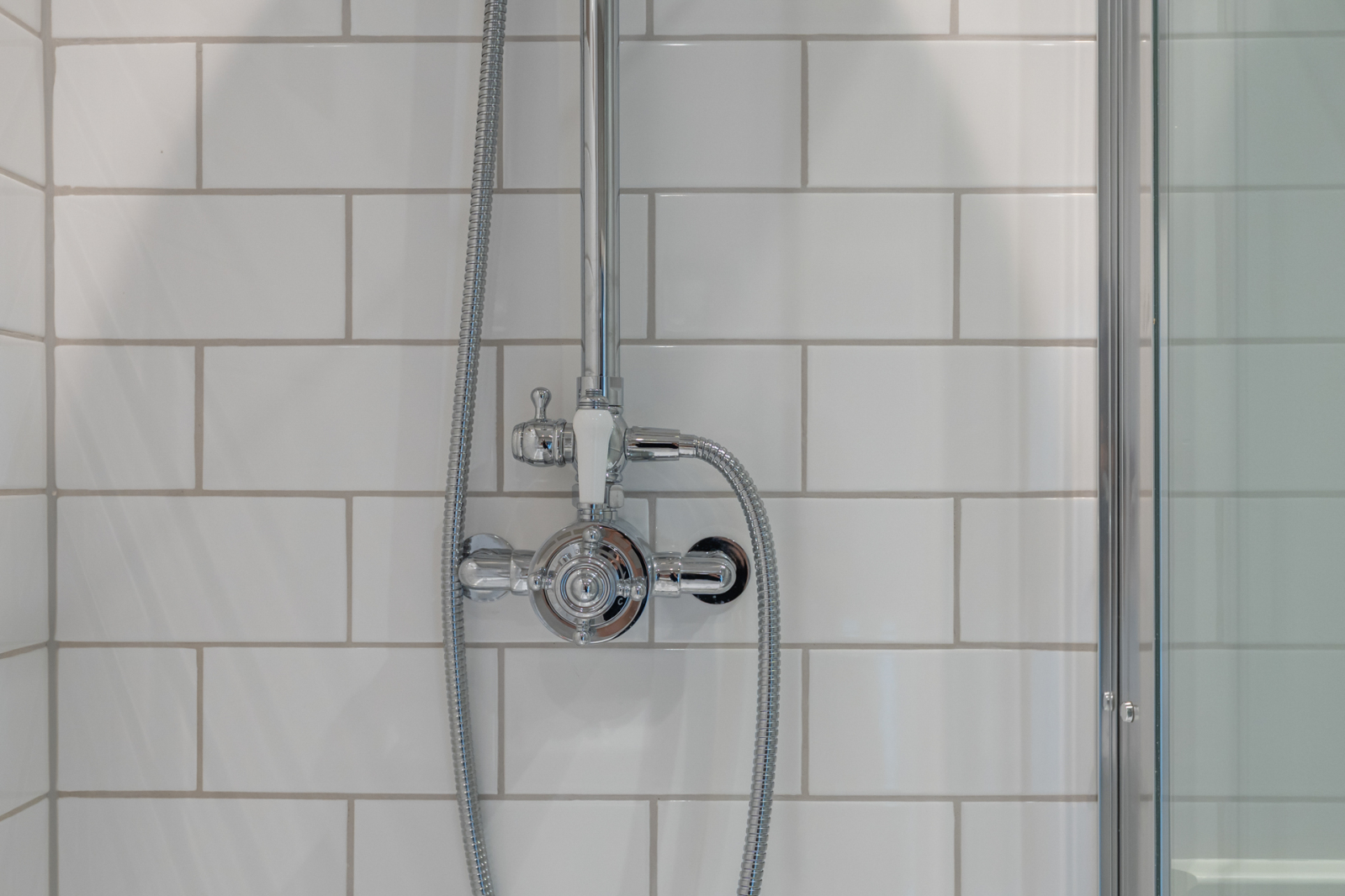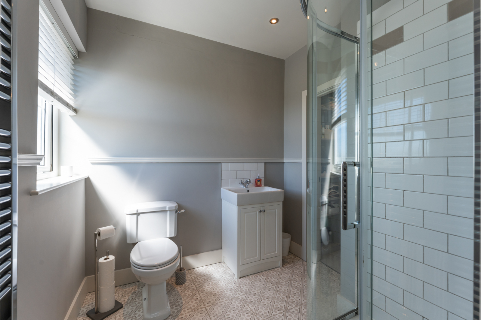 Traditional style white suite comprising: Large separate fully tiled shower cubicle, rain head and telephone hand shower, vanity sink unit with mixer taps, low flush WC, large chrome towel radiator, ceramic tiled floor, LED recessed spotlighting, extractor fan.
