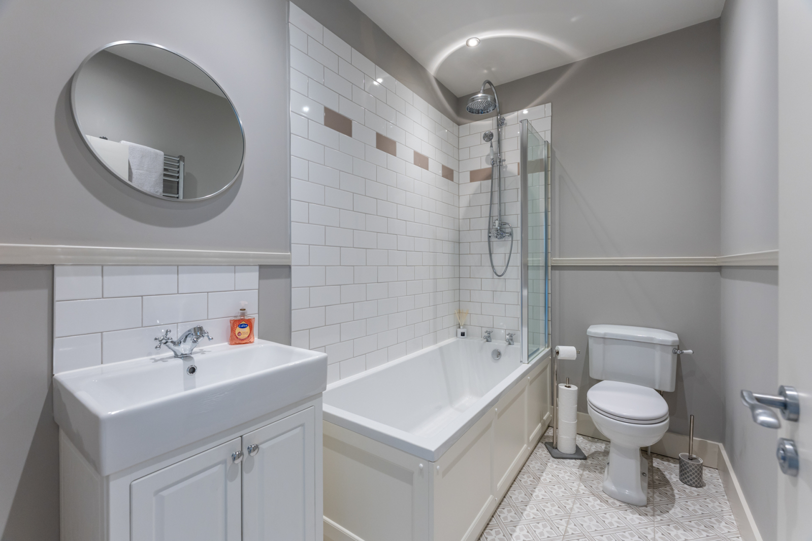Traditional style white suite comprising: Panelled bath with thermostatically controlled shower over with rain head and telephone hand shower, shower screen, vanity sink unit with mixer taps, low flush WC, large chrome towel radiator, wall tiling, ceramic tiled floor, LED recessed spotlighting, extractor fan.