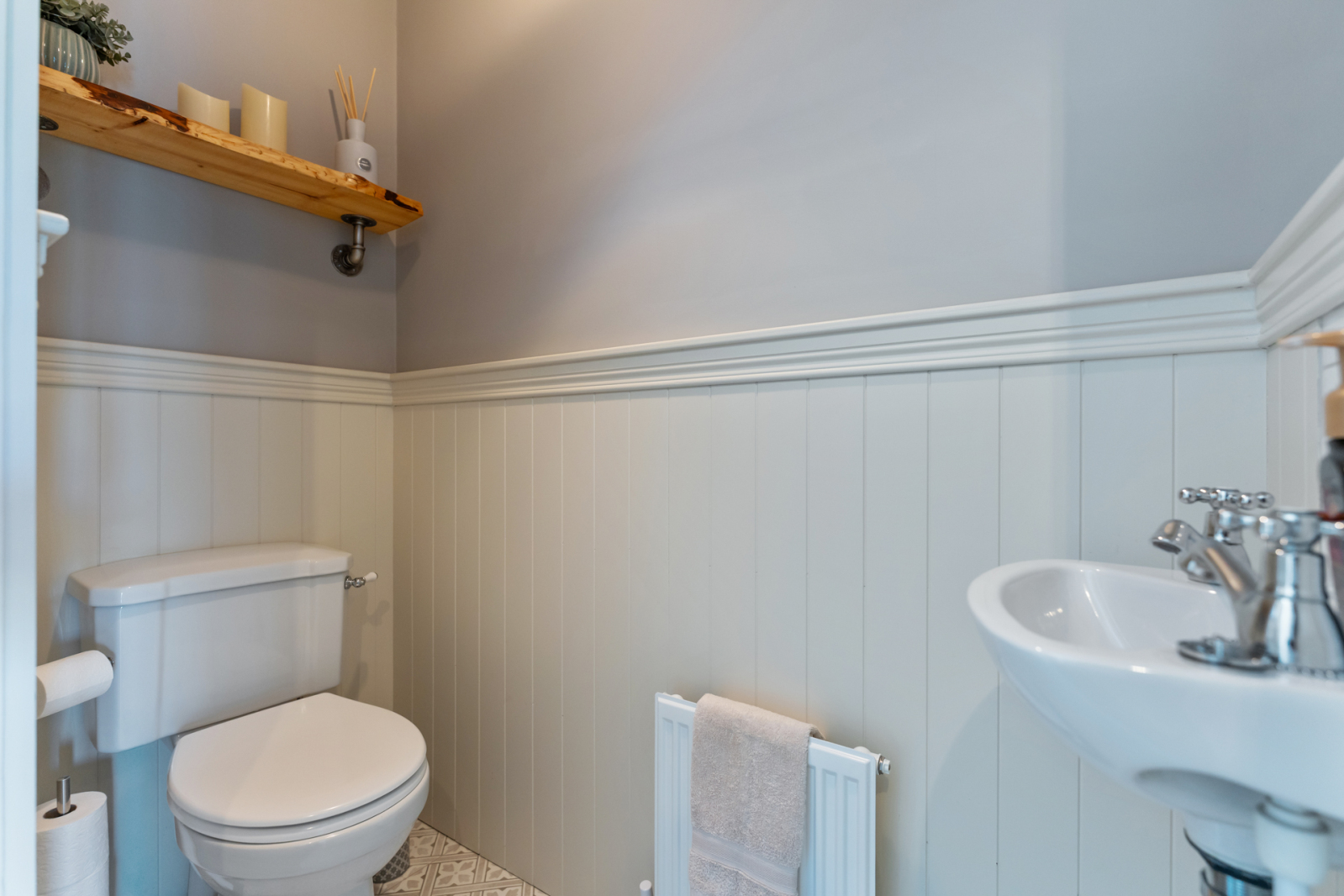 Tradidional style white suite, wall mounted wash hand basin, low flush WC, wall panelling, ceramic tiled floor, extractor fan.