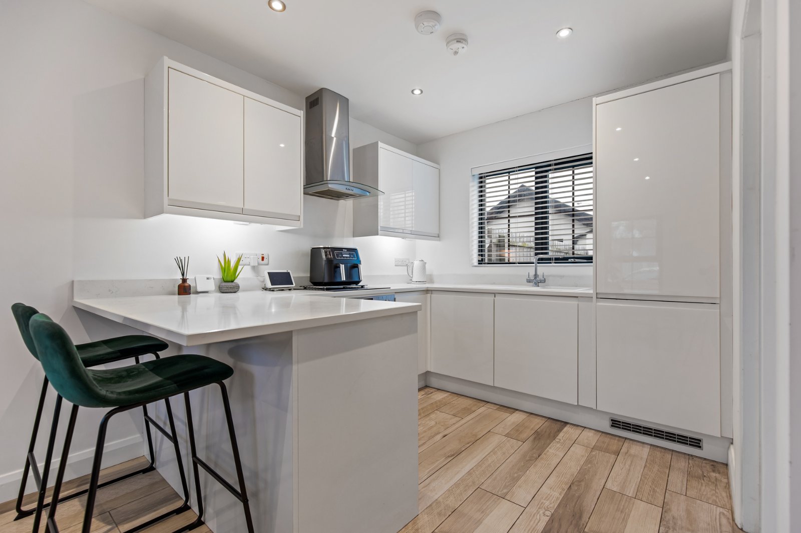 Single drainer stainless steel sink unit with mixer taps, range of high and low level white high gloss units, Quartz worktops, concealed gas boiler, plumbed for washing machine, ceramic tiled floor, extractor fan, black uPVC double glazed door to rear.