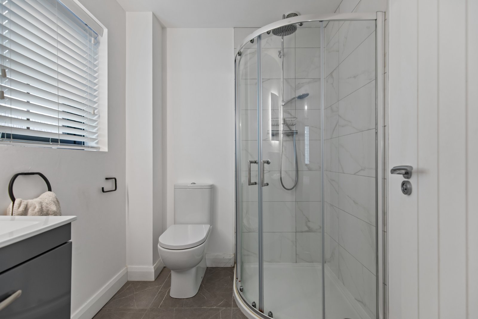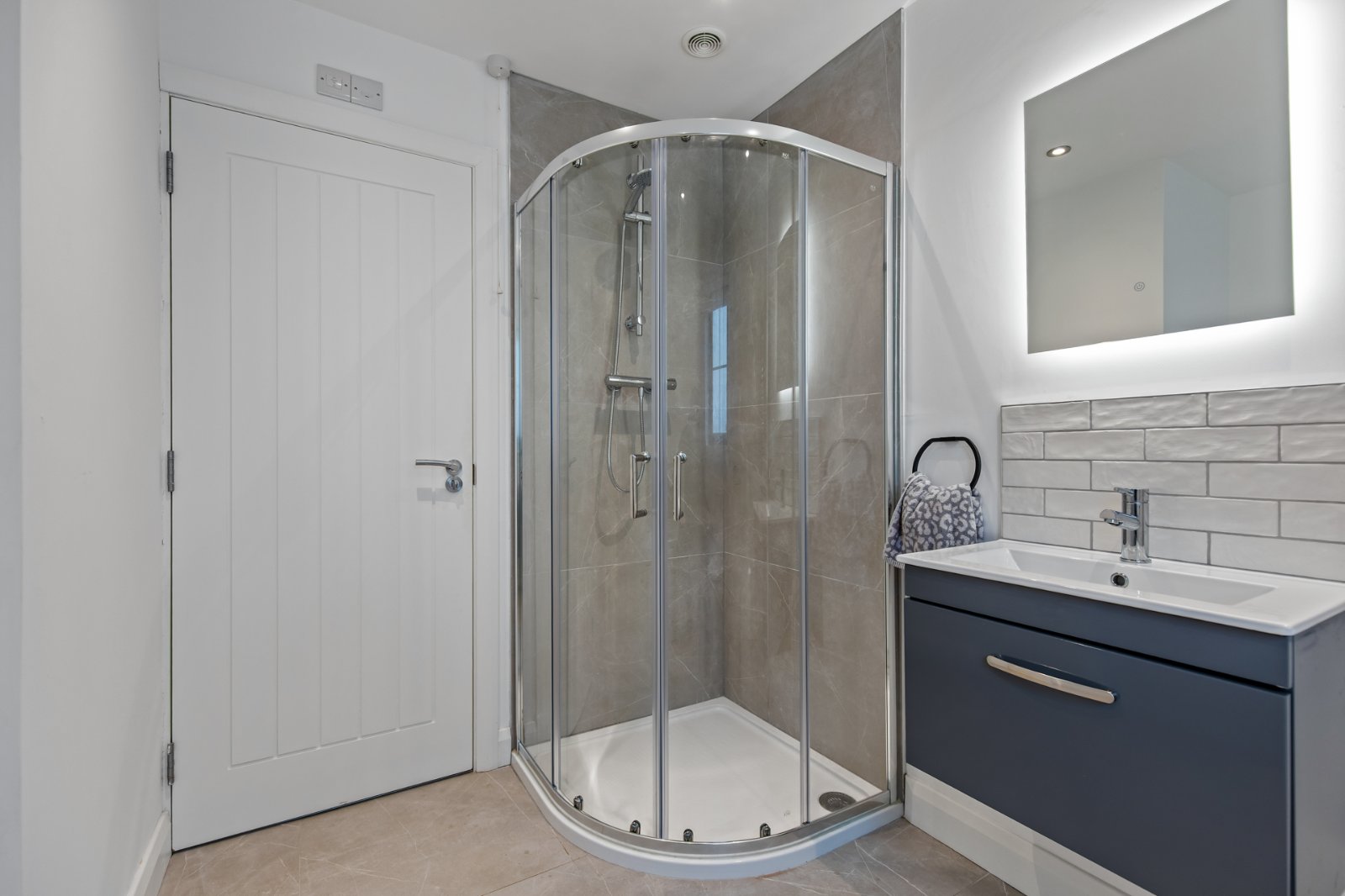 Modern white suite comprising: Separate fully tiled shower cubicle with thermostatically controlled shower, rain head and telephone hand shower, floating vanity sink unit with mixer taps, push button WC, ceramic tiled floor, LED recessed spotlighting, extractor fan, chrome towel radiator, wired for wall mounted mirror.