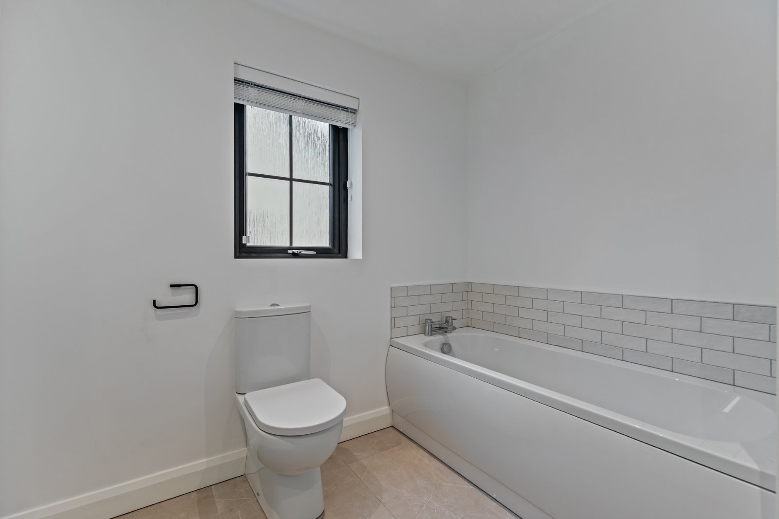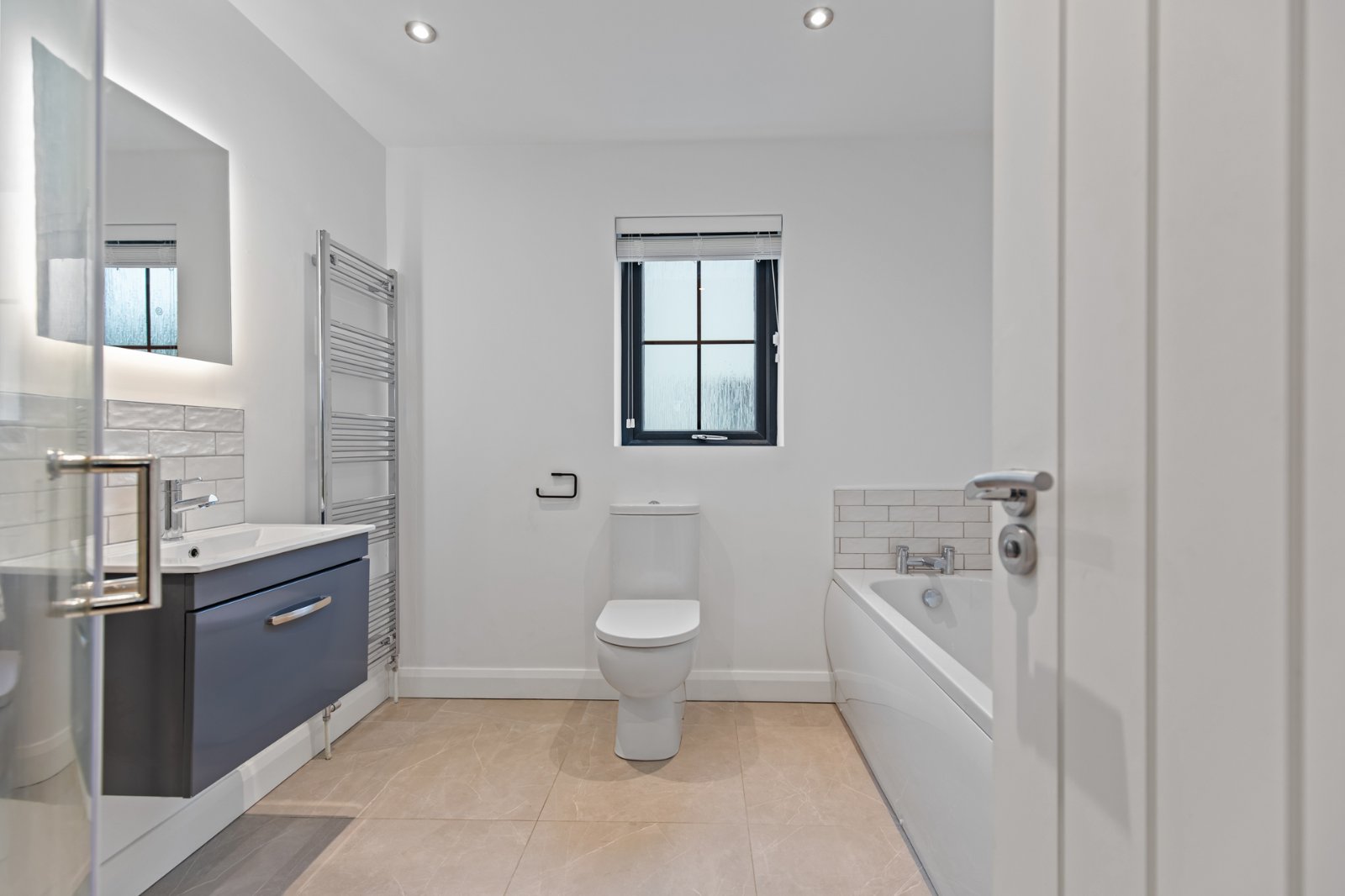 Modern white suite comprising: Panelled bath with mixer taps and tiled splashback, separate fully tiled shower cubicle with thermostatically controlled shower, telephone hand shower, floating vanity sink unit with mixer taps, push button WC, chrome towel radiator, LED recessed spotlighting, extractor fan.