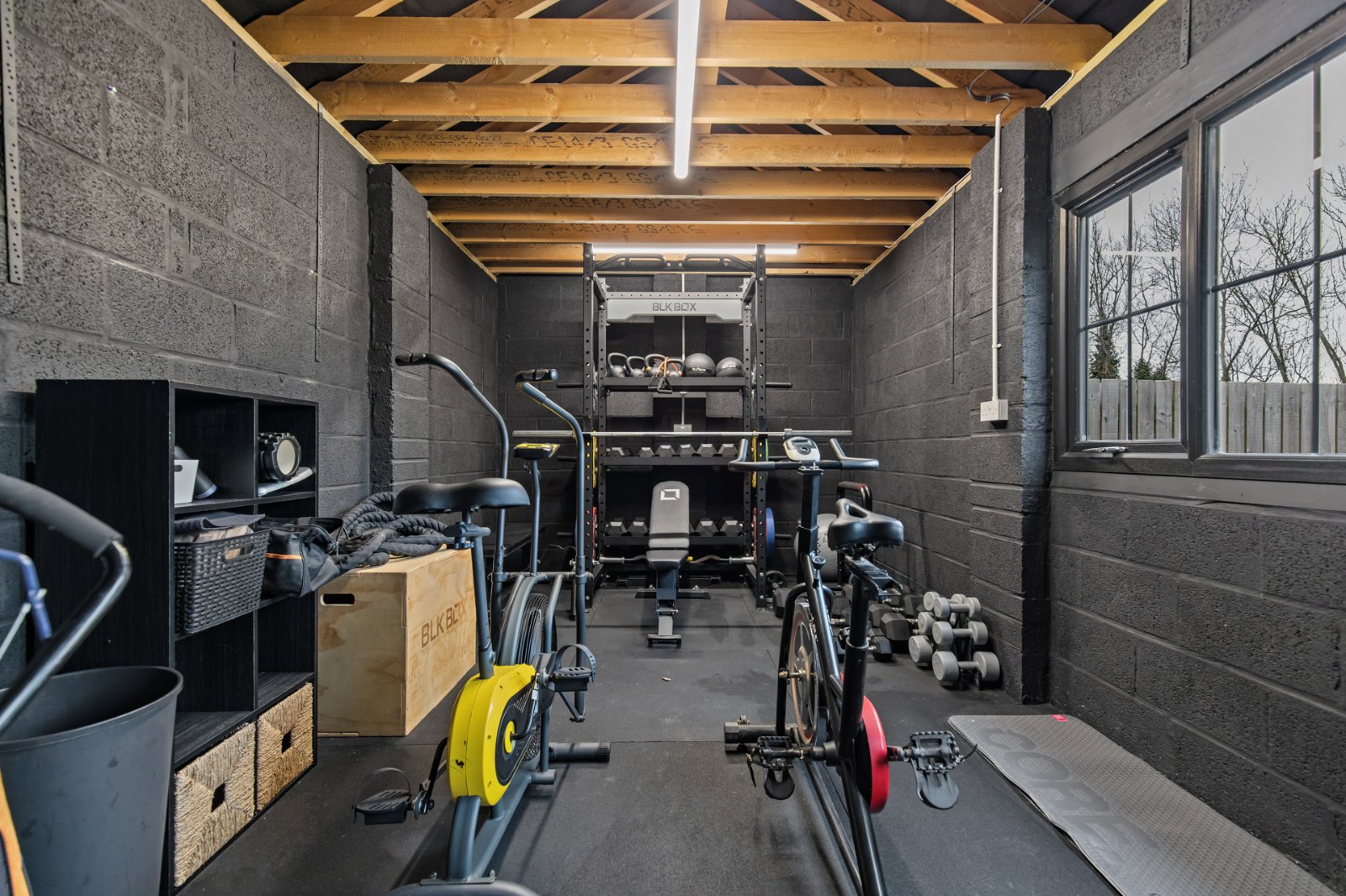 Black roller door, light and power, uPVC double glazed side pedestrian door and window. Approached via large tarmac driveway.