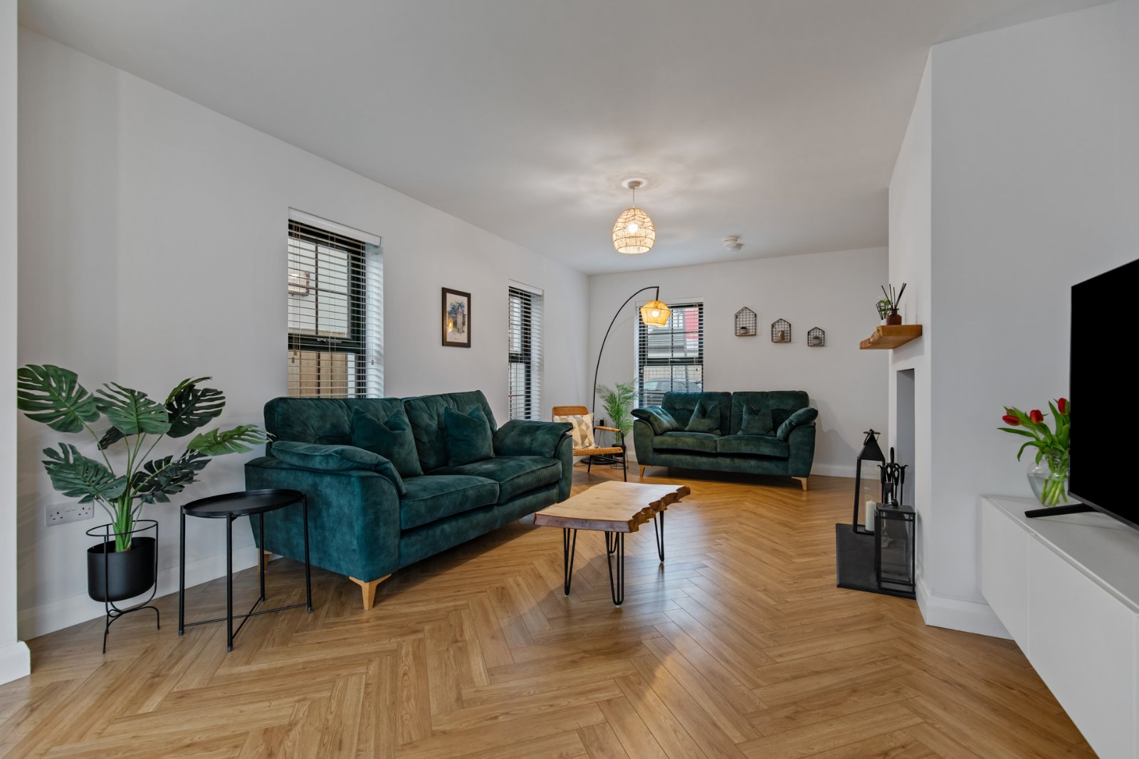 This beautifully presented home will be well suited to growing families or those seeking to downsize from a larger detached property to gain better convenience. Briefly comprising of entrance hall, large lounge which is open to a beautiful sunroom with fireplace, stove and live edge floating mantle, there is also downstairs cloakroom with modern white suite, trendy kitchen/ dining space plus a separate utility room. The kitchen is fitted with white high gloss units, quartz tops, and integrated appliances.