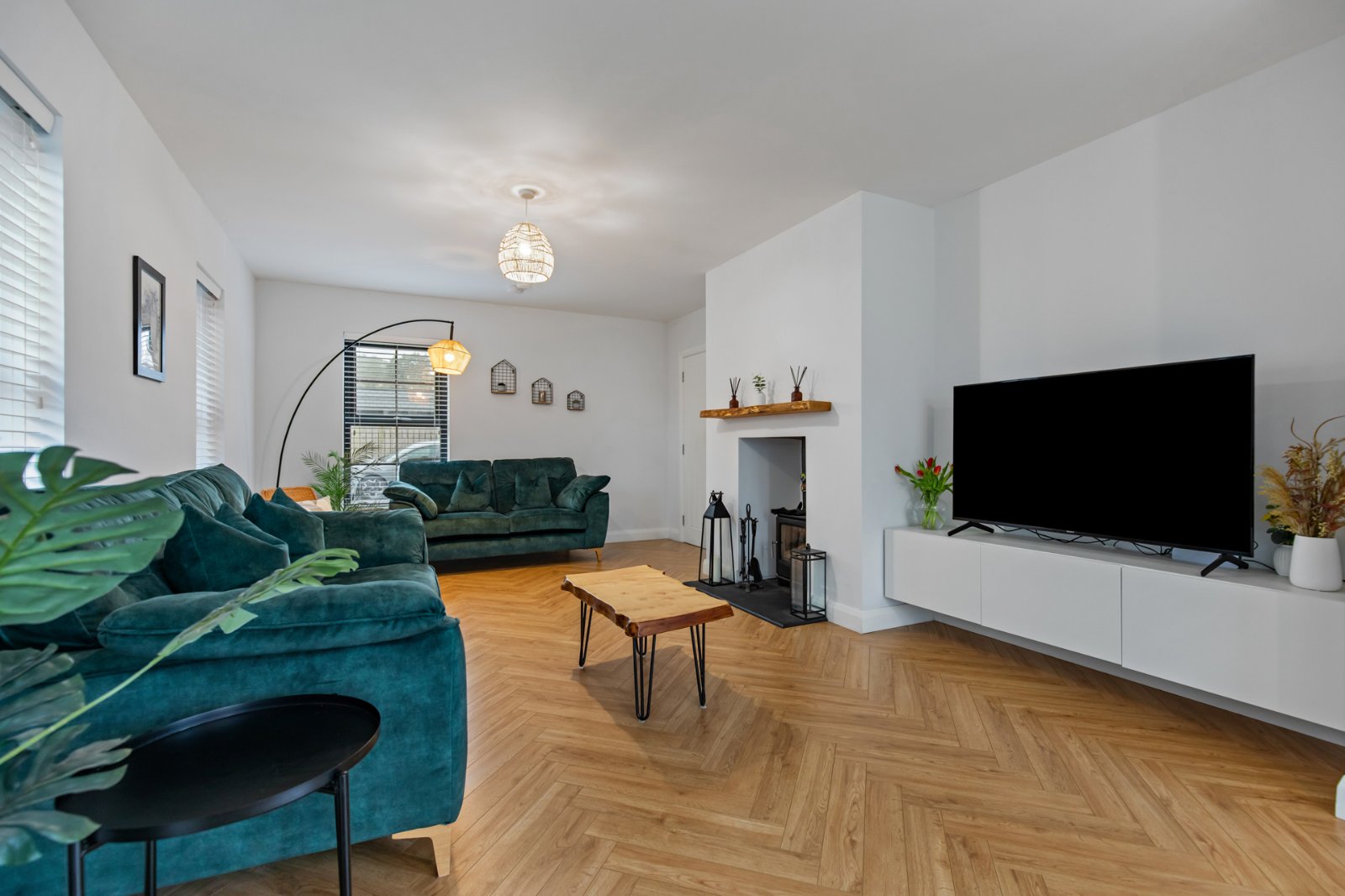 Attractive fireplace, floating live edge mantle, wood burning stove, slate hearth, herringbone polished laminate floor, TV and telephone points, black uPVC double glazed French doors to rear.