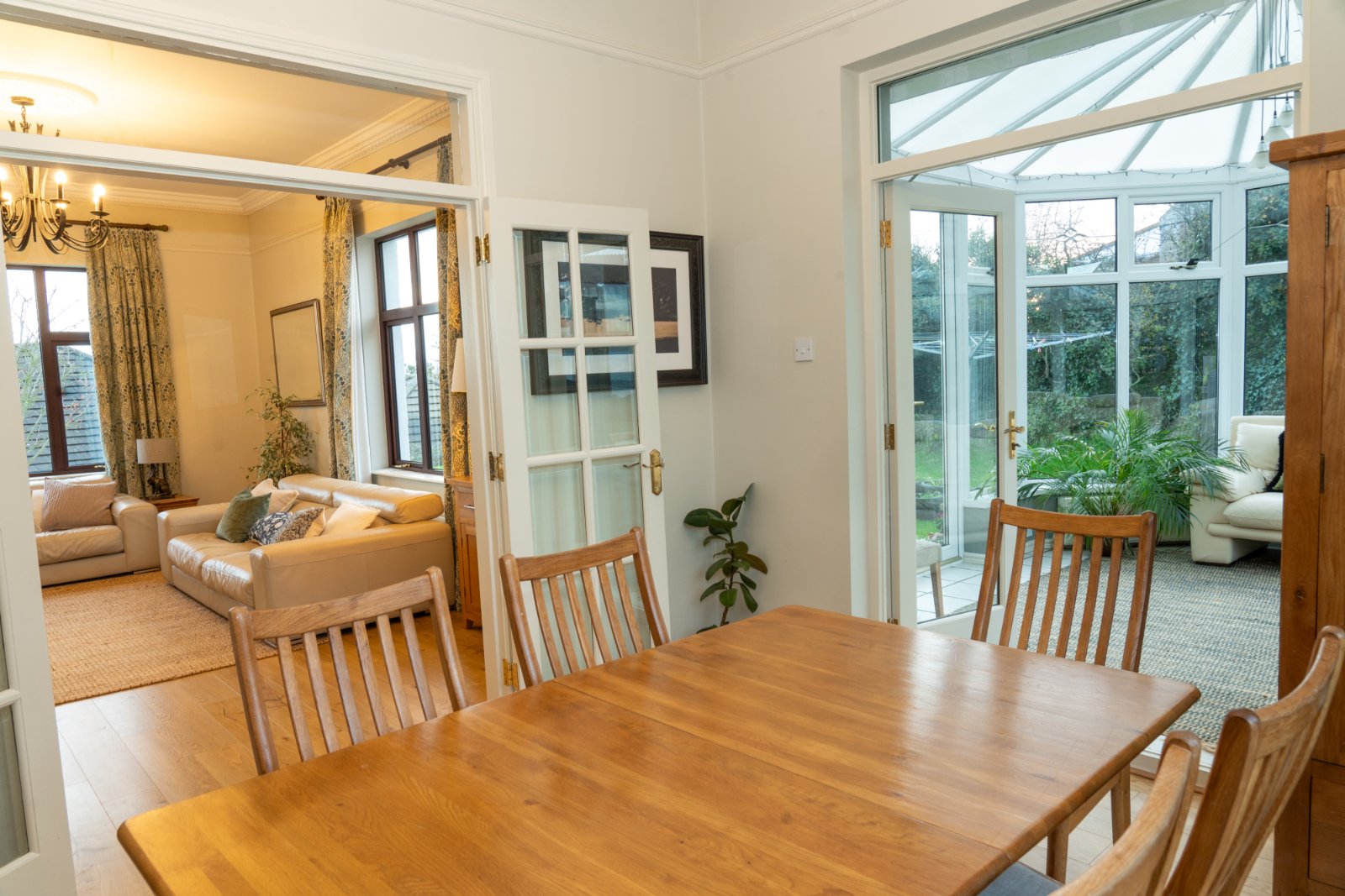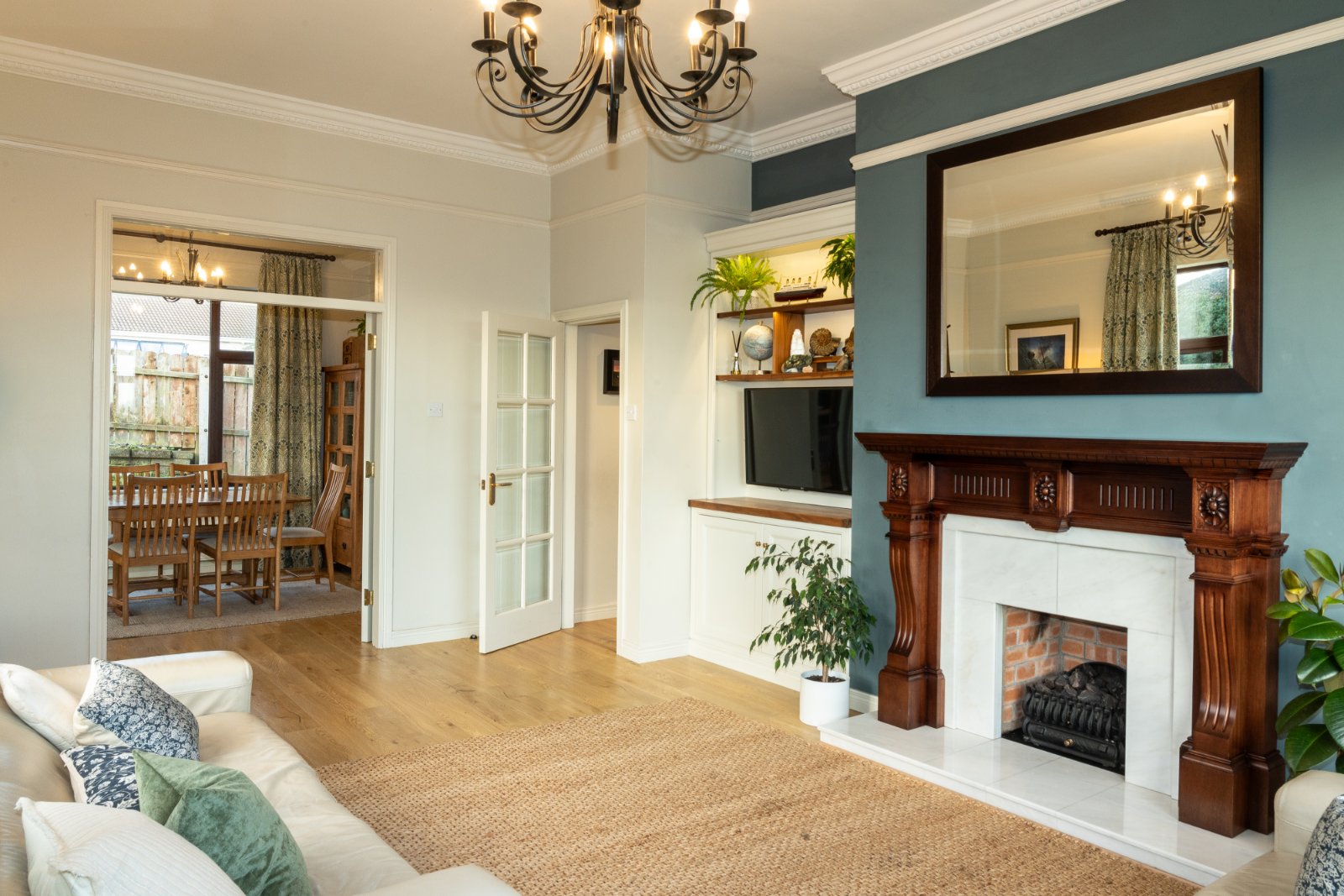Attractive carved mahogany fire surround with white marble inset and hearth, gas fire, picture rail, corniced ceiling, feature 10 foot high ceiling, durable oak effect floor, dual aspect with views to Strangford Lough and the Mourne Mountains, glazed doors to: