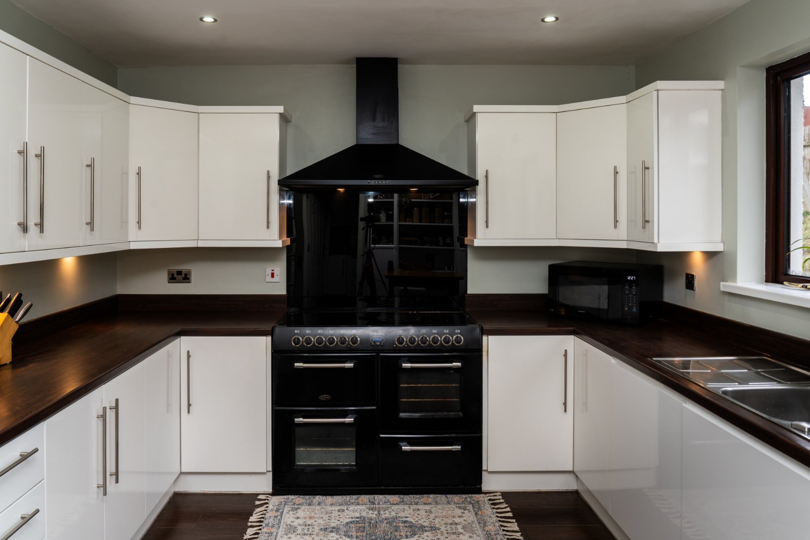Range of high and low level white gloss units with roll edge work surfaces, bowl and a quarter 'Teka' single drainer stainless steel sink unit with mixer taps, freestanding black 'Belling' Kensington range cooker, black glass splashback, black 'Belling' extractor hood, integrated fridge and dishwasher, bin/waste storage, pull out larder, concealed lighting, wood effect ceramic tiled floor, LED recessed spotlighting.