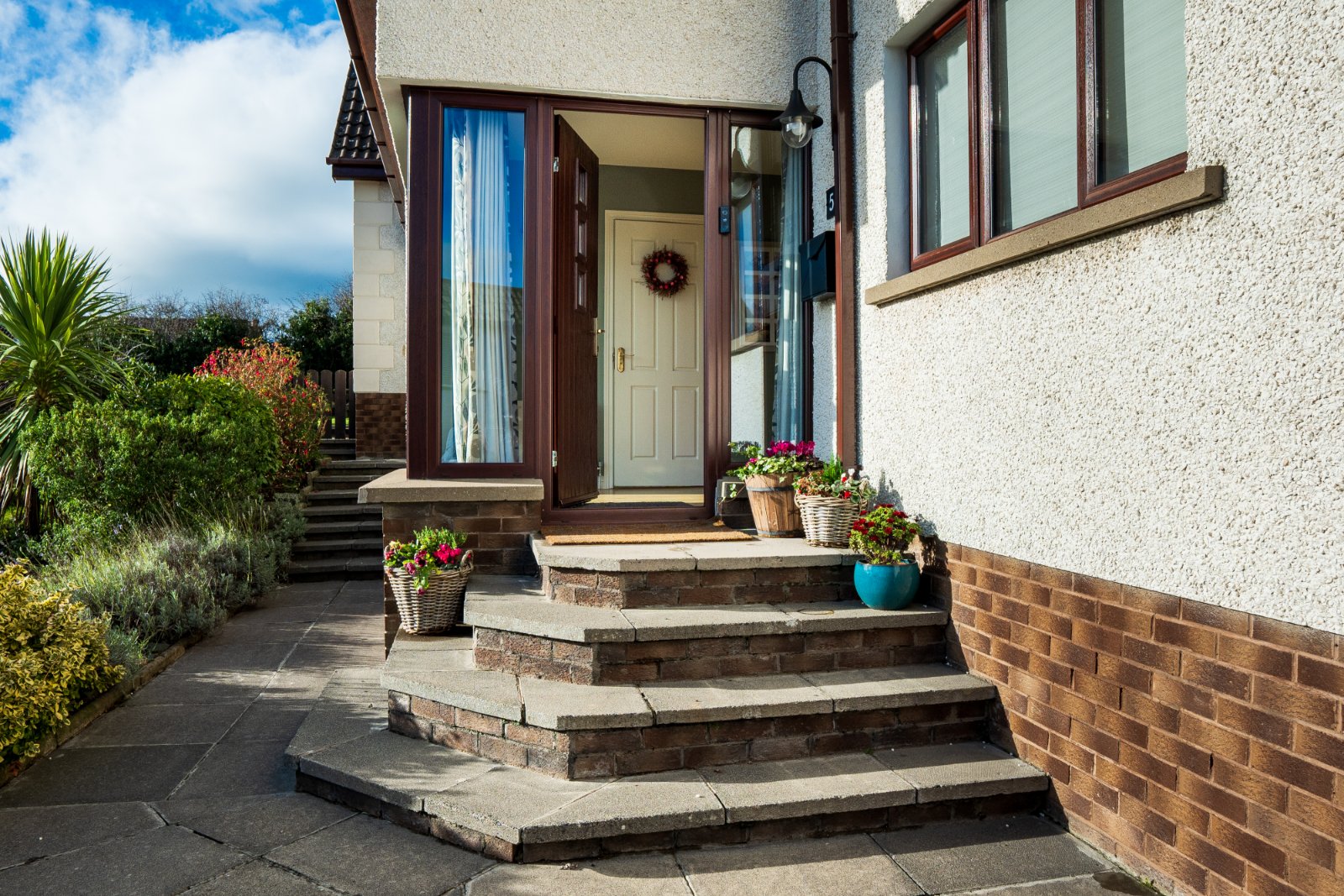 Steps leading to uPVC composite front door with matching side lights, outside light to: