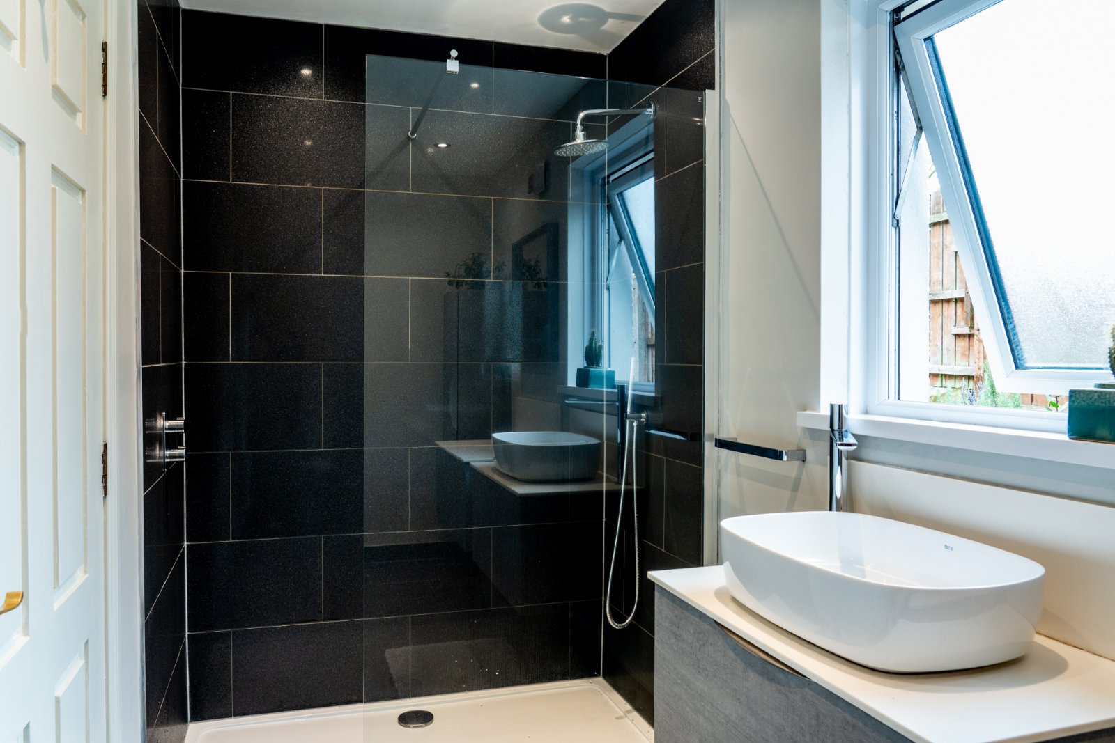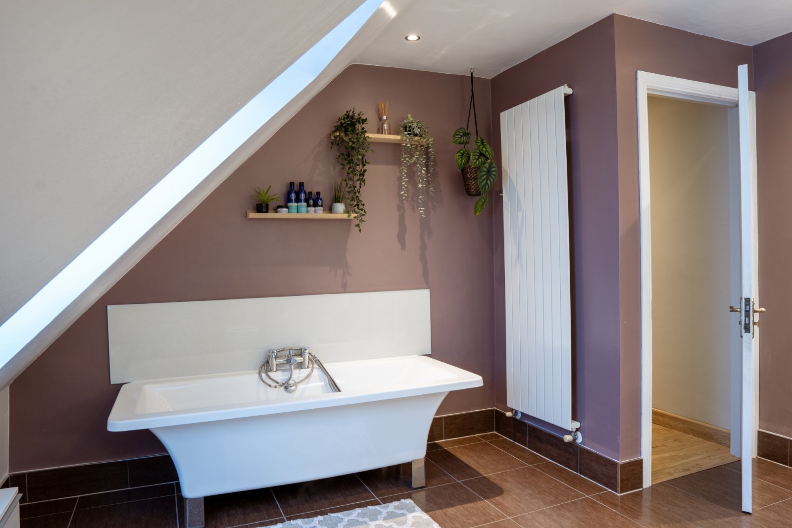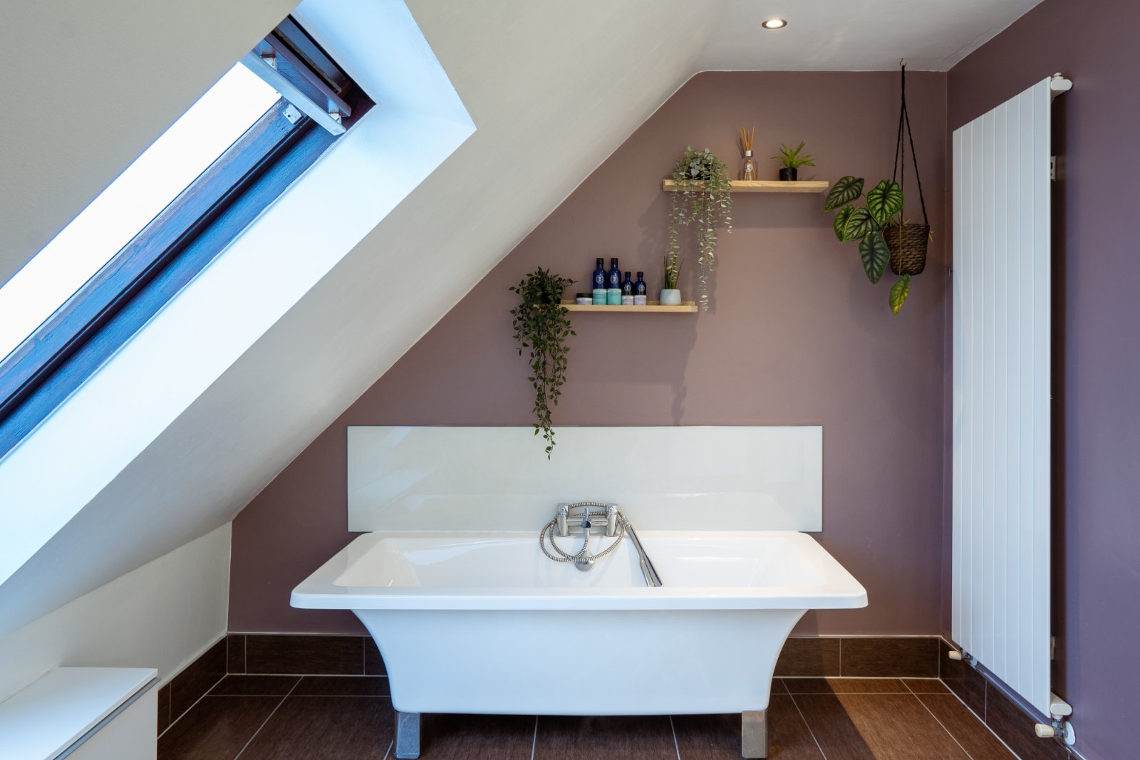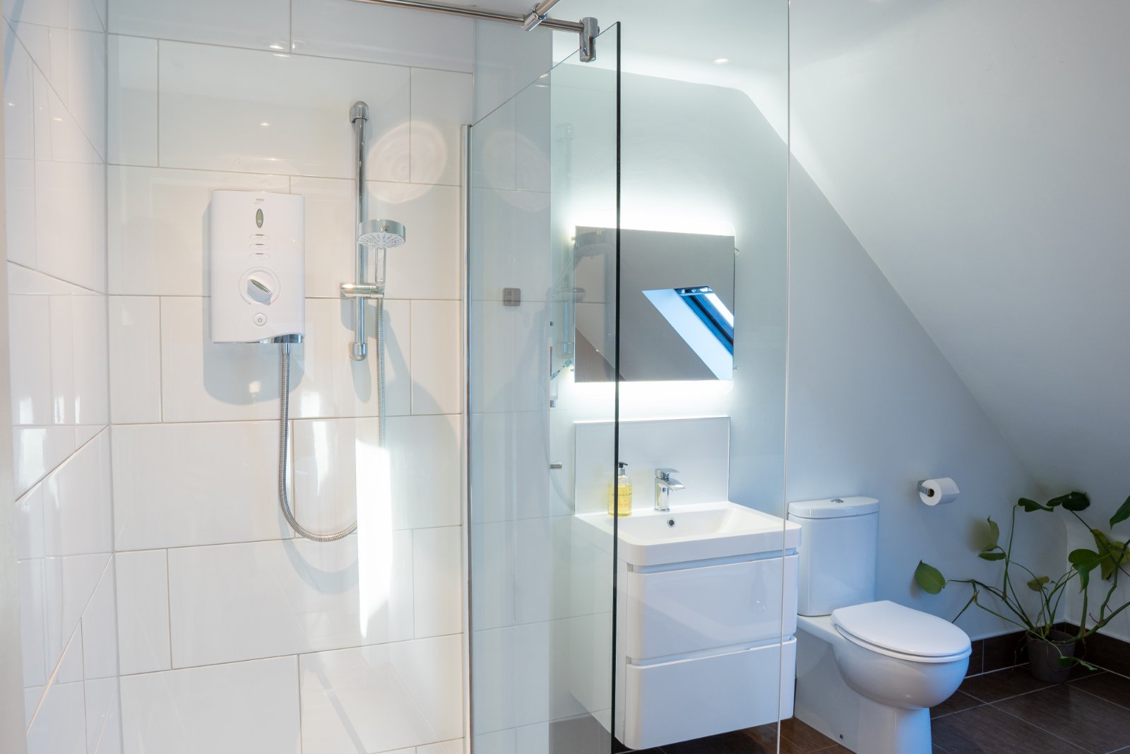 Ultra modern white suite comprising: Freestanding bath with mixer taps and telephone hand shower, large walk in fully tiled shower cubicle with Mira Sport Airboost thermostatically controlled shower unit, glass panel, floating vanity sink unit with mixer taps, push button WC, built in low level storage unit, ceramic tiled floor, LED recessed spotlighting, extractor fan, velux window, modern vertical radiator.