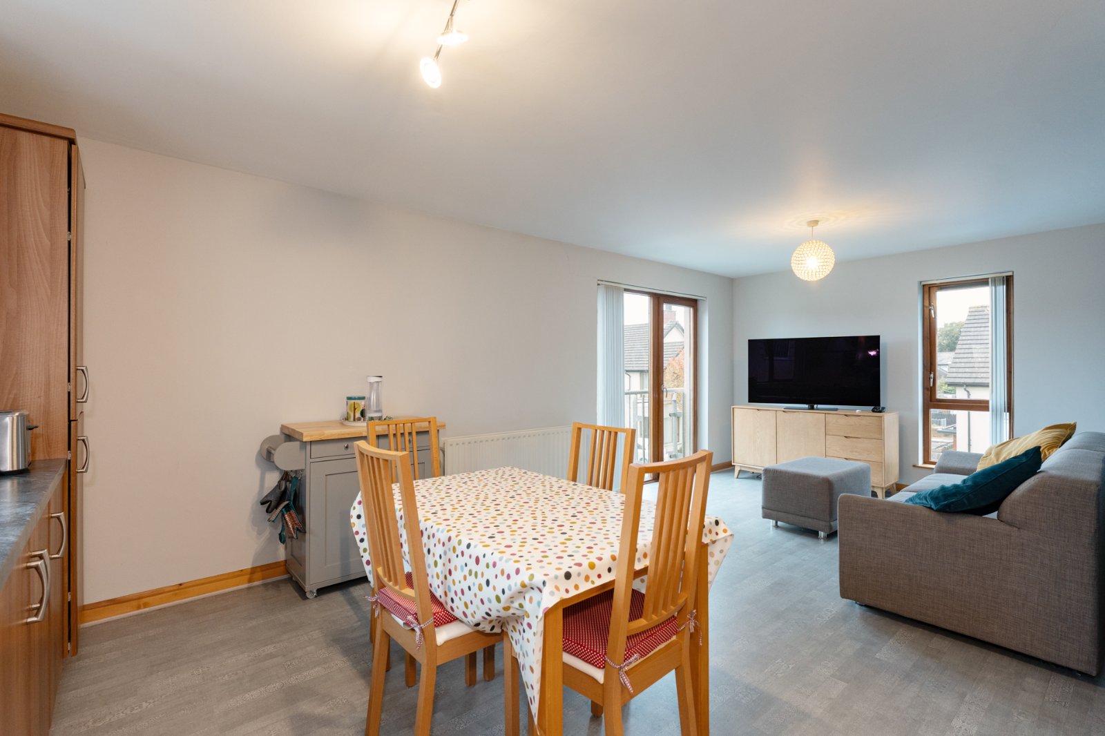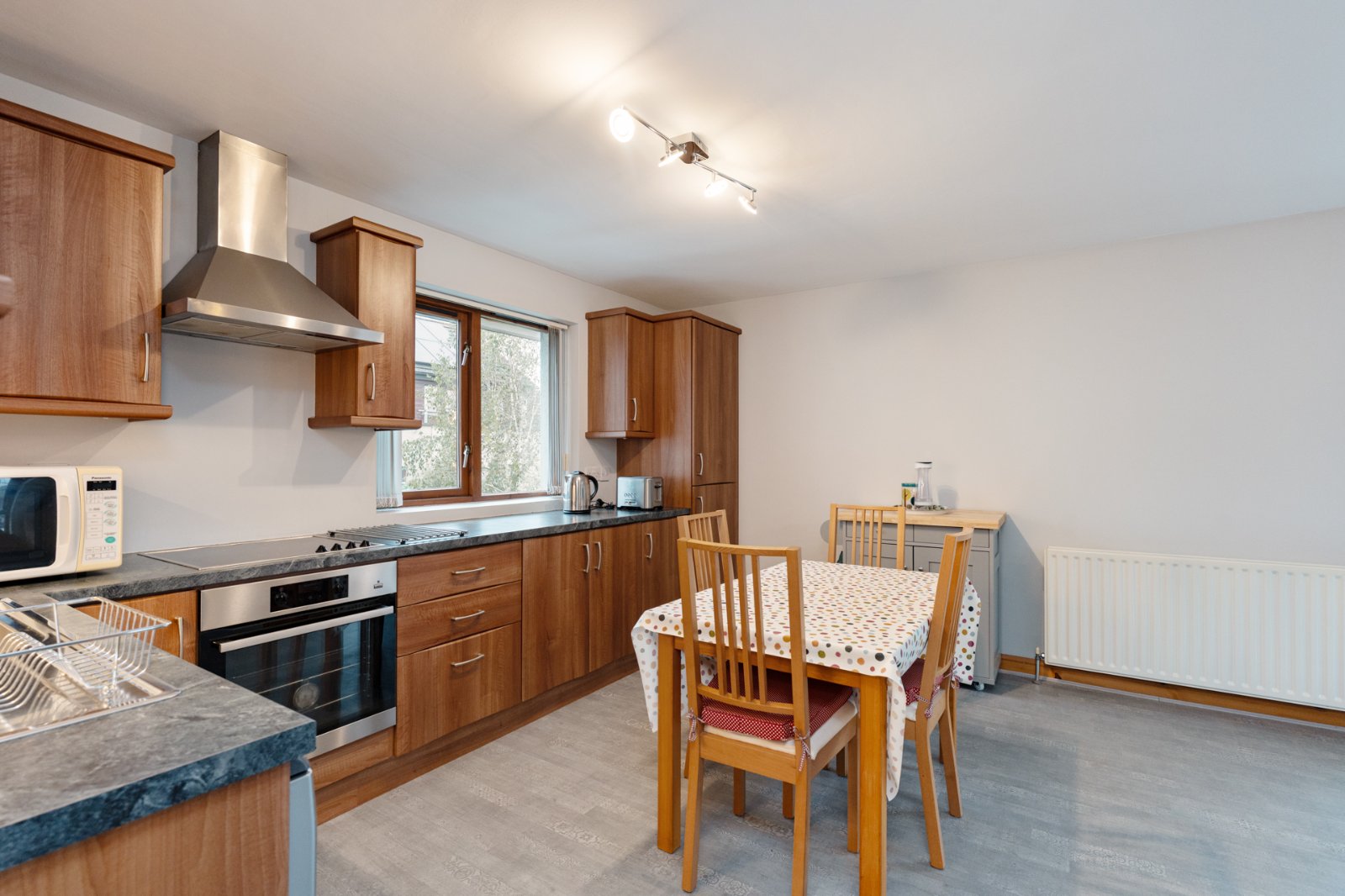 Single drainer stainless steel sink unit with mixer taps, range of high and low level modern units, Formica roll edge work surfaces, 4 ring ceramic hob unit, built in oven, stainless steel extractor hood, integrated fridge freezer, plumbed for dishwasher, wine rack, concealed lighting, polished laminate floor, TV point, triple aspect, views to Scrabo Tower, double glazed door to Juliet Balcony.