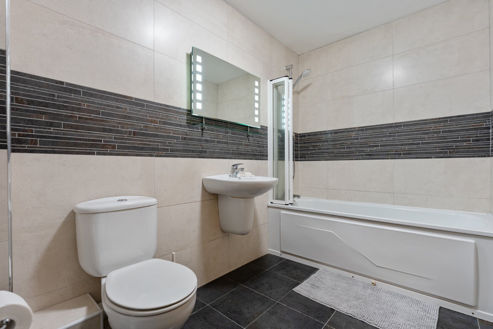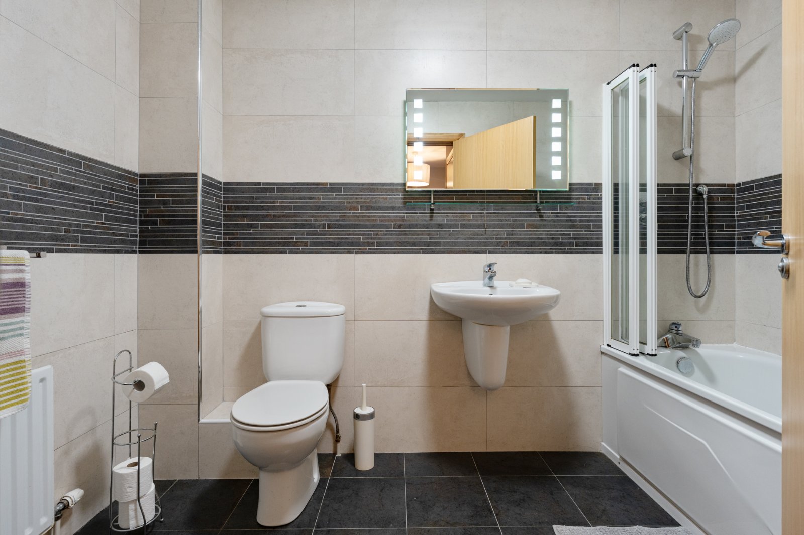 Modern white 'Roca' suite comprising: Panelled bath with mixer taps and telephone hand shower over bath, shower screen, wall mounted wash hand basin with mixer taps, push button WC, fully tiled walls, ceramic tiled floor, extractor fan.