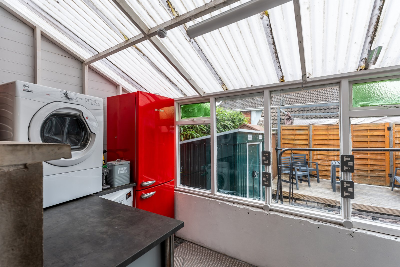 Ceramic tiled floor, plumbed for washing machine, door to rear.