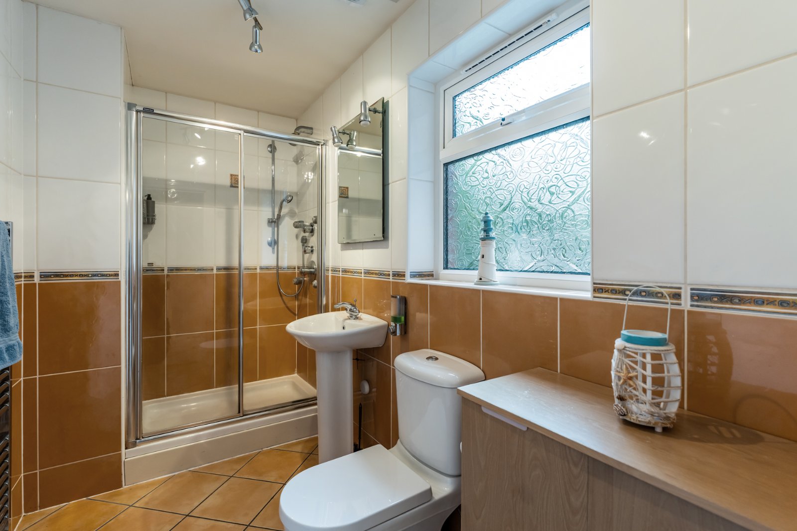 White suite comprising: Large separate fully tiled shower cubicle with thermostatically controlled shower, pedestal wash hand basin with mixer taps, push button WC, chrome towel radiator, fully tiled walls, ceramic tiled floor.