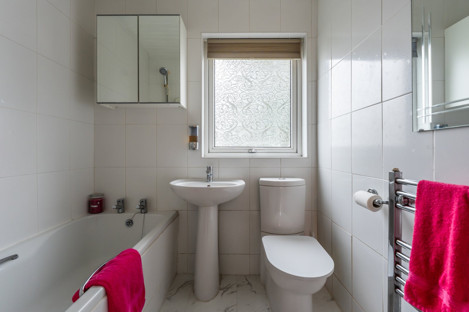 White suite comprising: Panelled bath with 'Triton' thermostatically controlled shower unit over bath, pedestal wash hand basin with mixer taps, push button WC, chrome towel radiator, fully tiled walls, marble effect vinyl tiled floor, concealed linen cupboard, Baxi Phoenix Gas boiler.