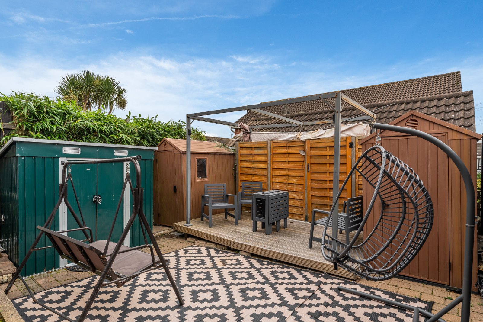 Grey composite fencing with electronic pedestrian gate and key pad. Metal garden shed - fully insulated, electric underfloor heating, broadband connection, light, and power. Two small brown composite sheds, timber decking.