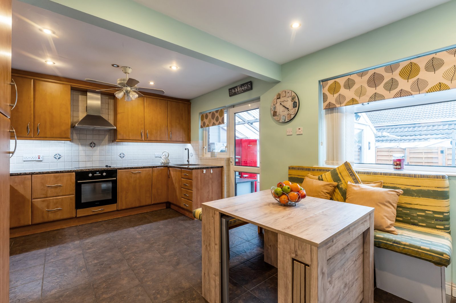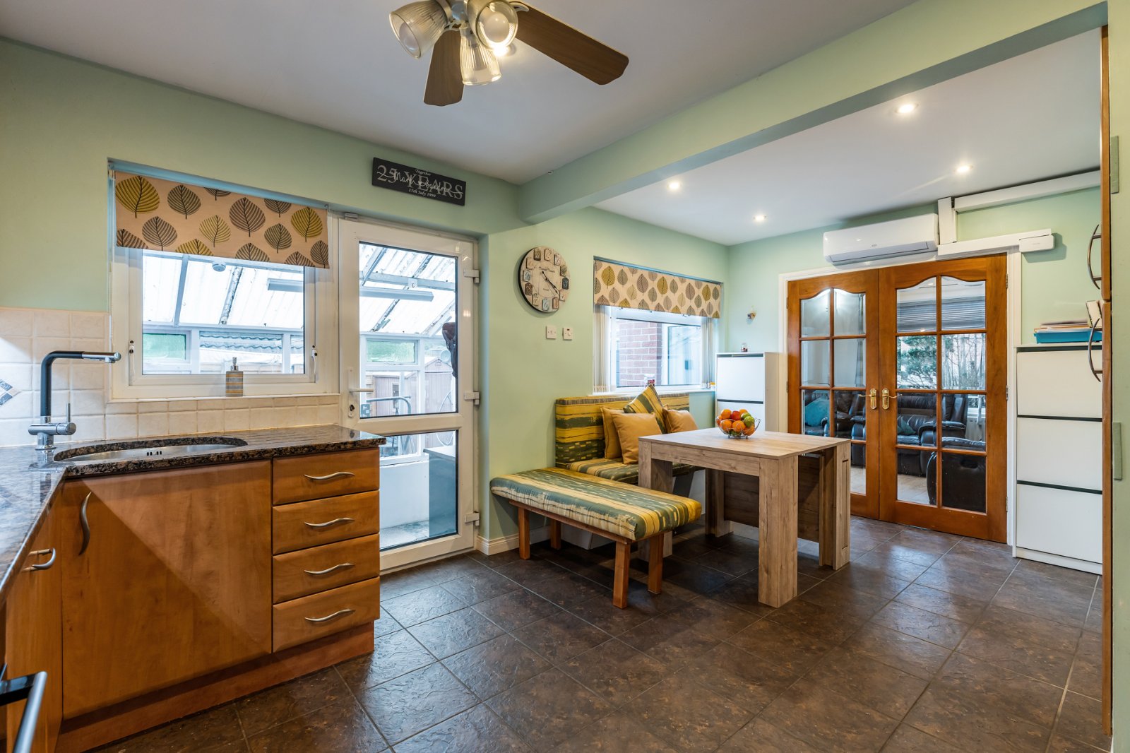 Single drainer stainless steel sink unit with mixer taps, range of high and low level units, Formica roll edge work surfaces, 4 ring ceramic hob unit, double built in oven, stainless steel extractor hood, display cabinets, dishwasher, LED concealed lighting, wall tiling, ceramic tiled floor, LED recessed spotlighting, custom bench seating, Argo air conditioning unit, glazed double doors to Sun Room. Door to:
