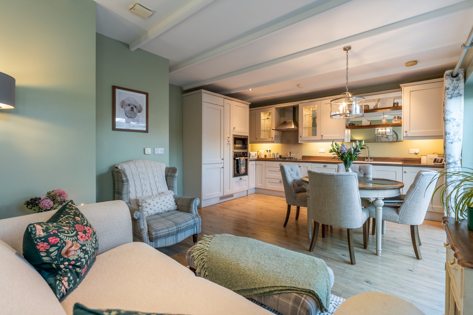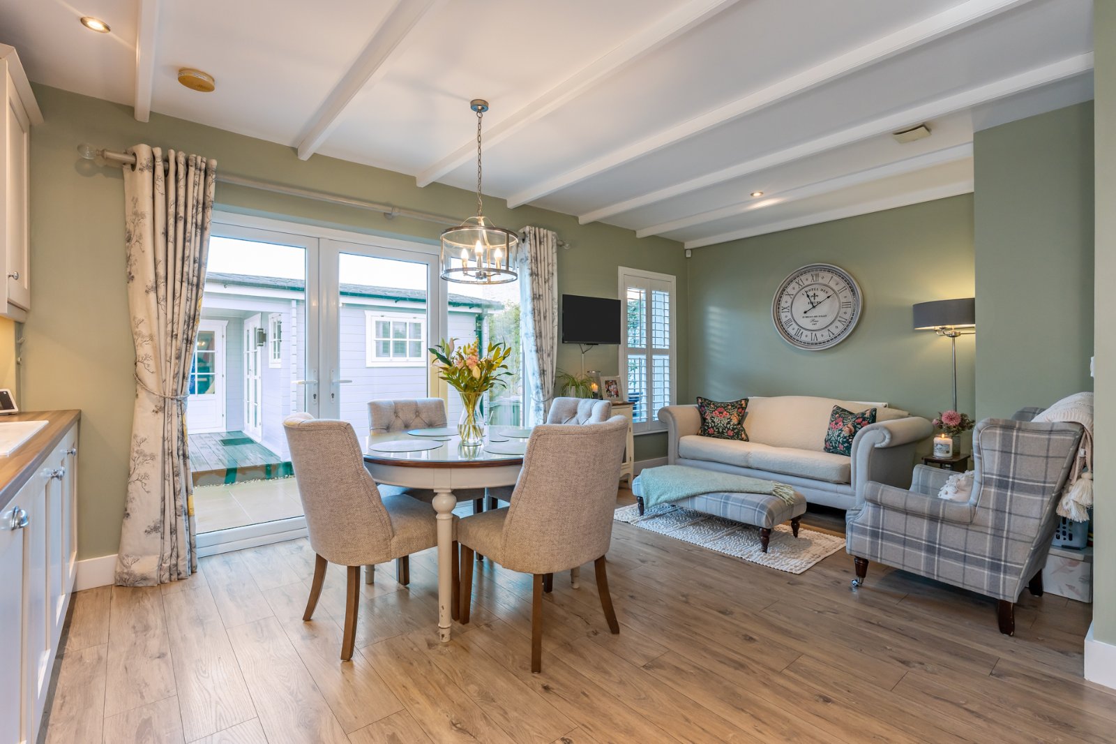 White Blanco 1.5 tub single drainer sink unit with mixer taps, excellent range of high and low level cream shaker style units, wood effect Formica roll edge work surfaces, 4 ring gas hob unit, built in oven and microwave, stainless steel extractor hoo, coloured glass splash back, integrated fridge freezer and dishwasher, pull out larder, concealed lighting, display cabinets, cook book shelf, LED recessed spotlighting, TV point, uPVC double glazed French doors to rear.