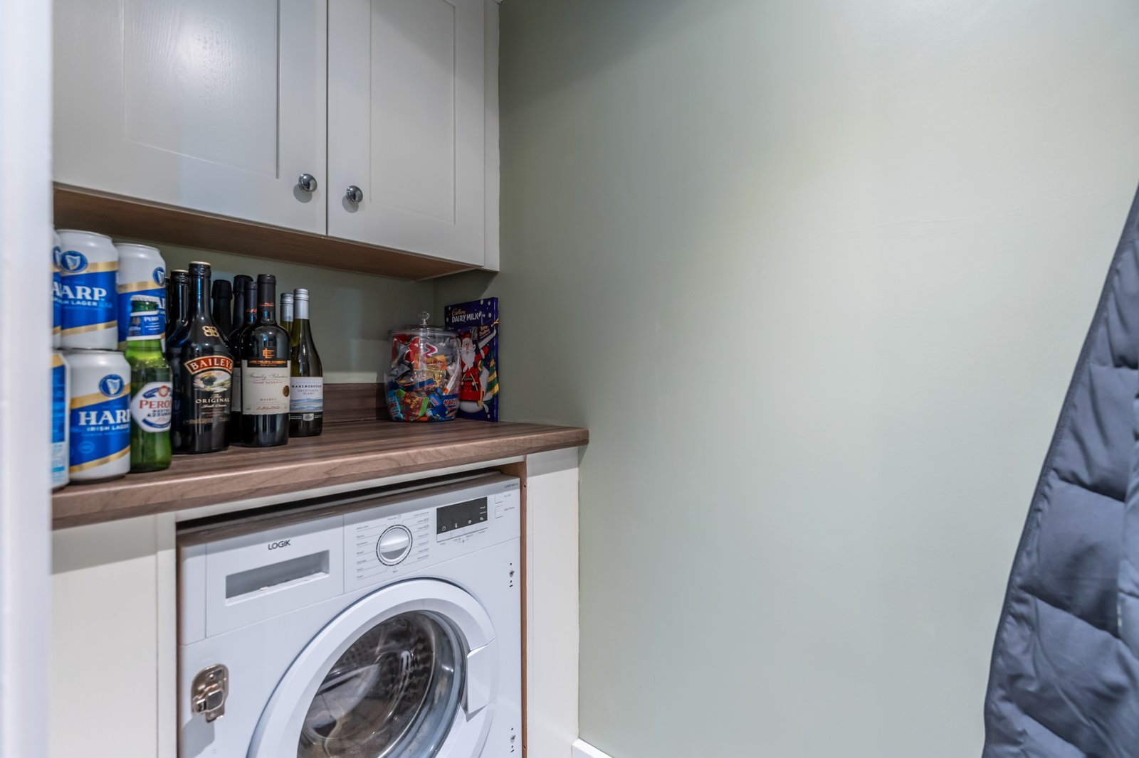 Range of high and low level cream shaker style units, wood effect Formica roll edge work surfaces, plumbed for washing machine, ceramic tiled floor, extractor fan, LED recessed spotlighting.