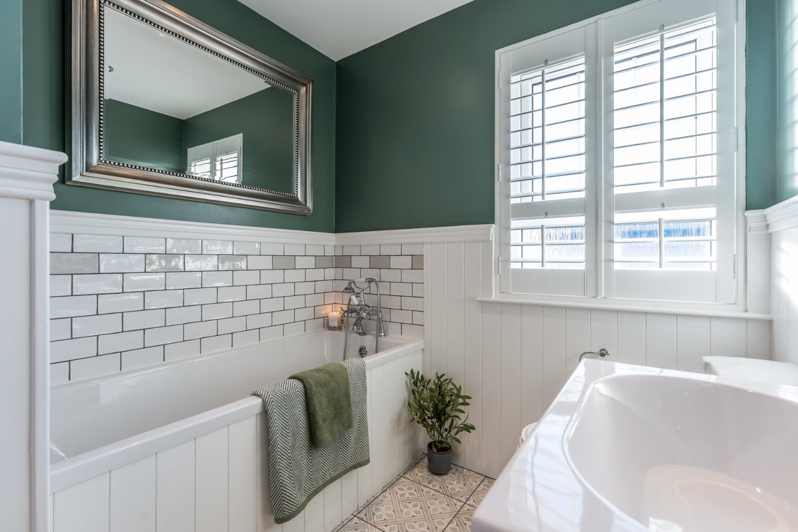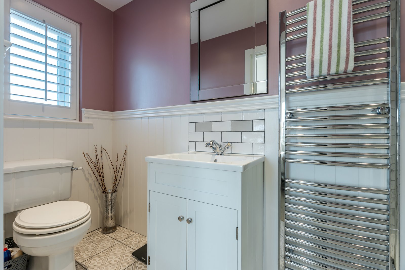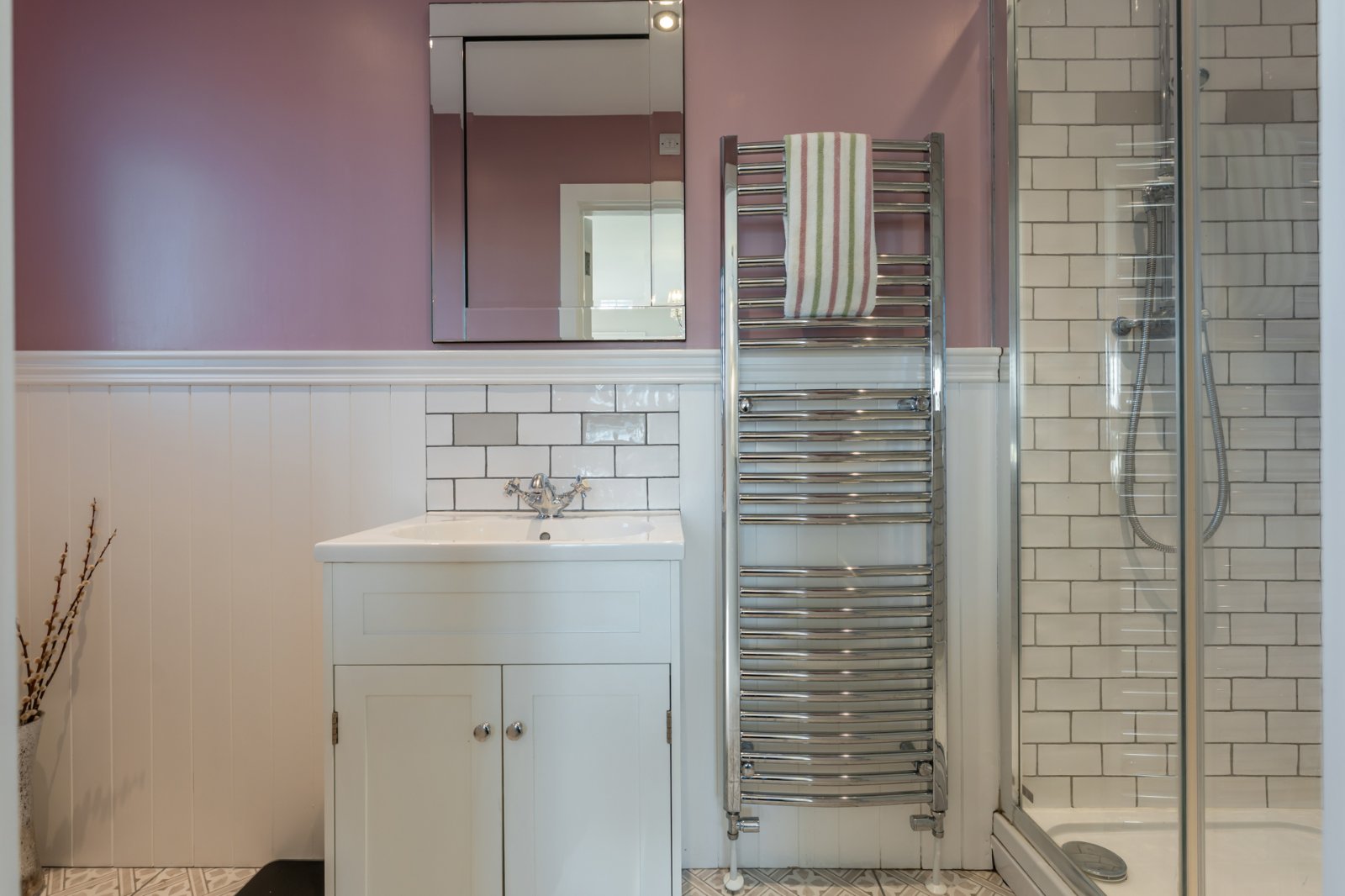 Traditional style white suite comprising: Panelled bath with mixer taps and telephone hand shower over bath, separate fully tiled shower cubicle with thermostatically controlled shower, rain head and telephone hand shower, vanity sink unit with mixer taps, low flush WC, wall panelling, wall tiling, ceramic tiled floor, LED recessed spotlighting, extractor fan, chrome towel radiator.