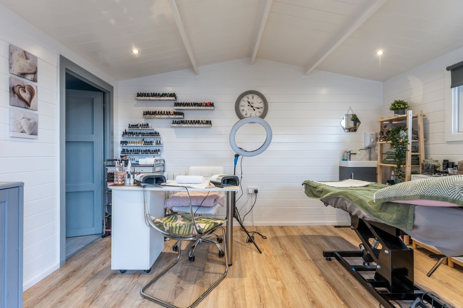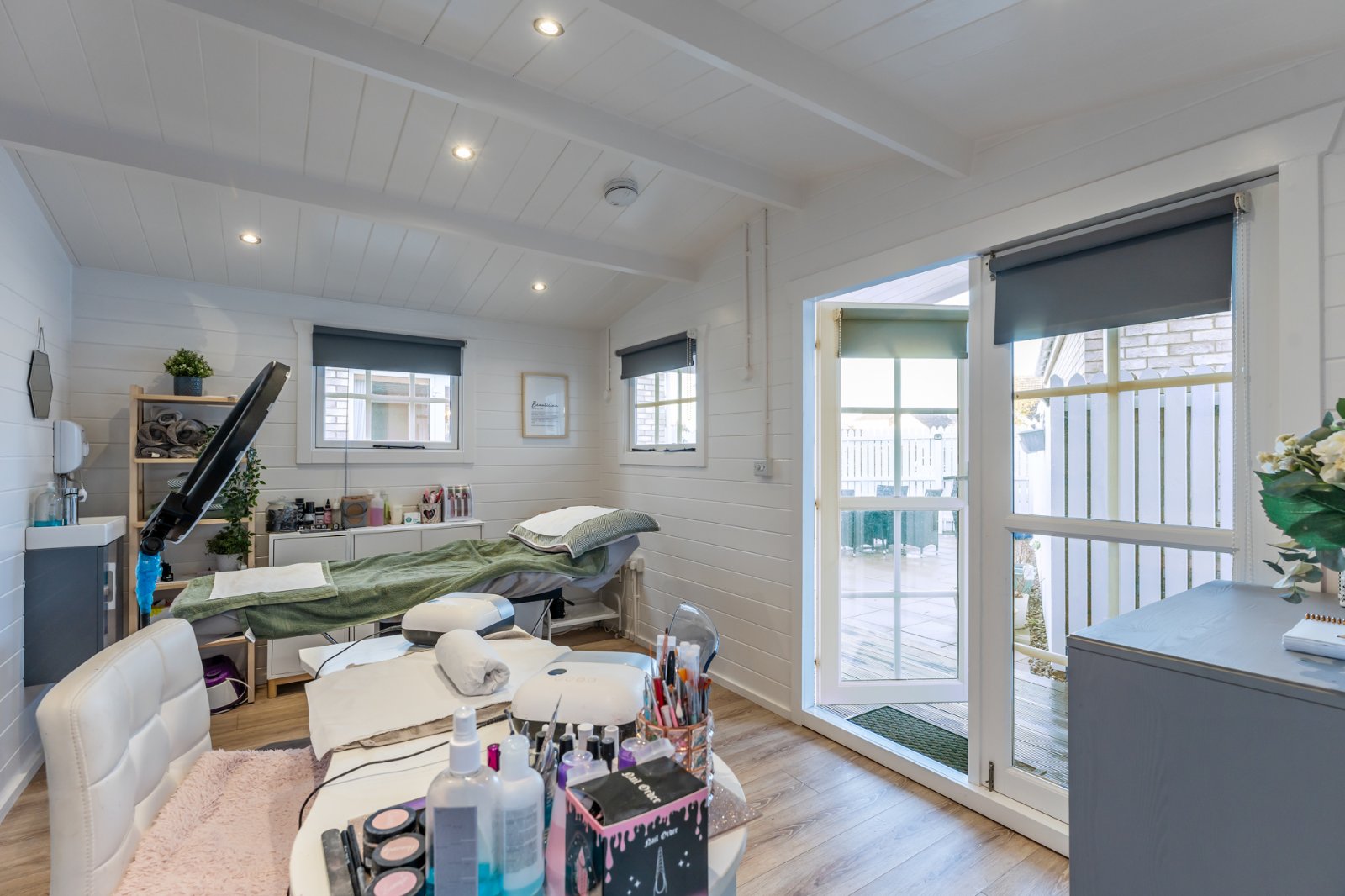 Glazed French doors. Light and power, polished laminate floor.