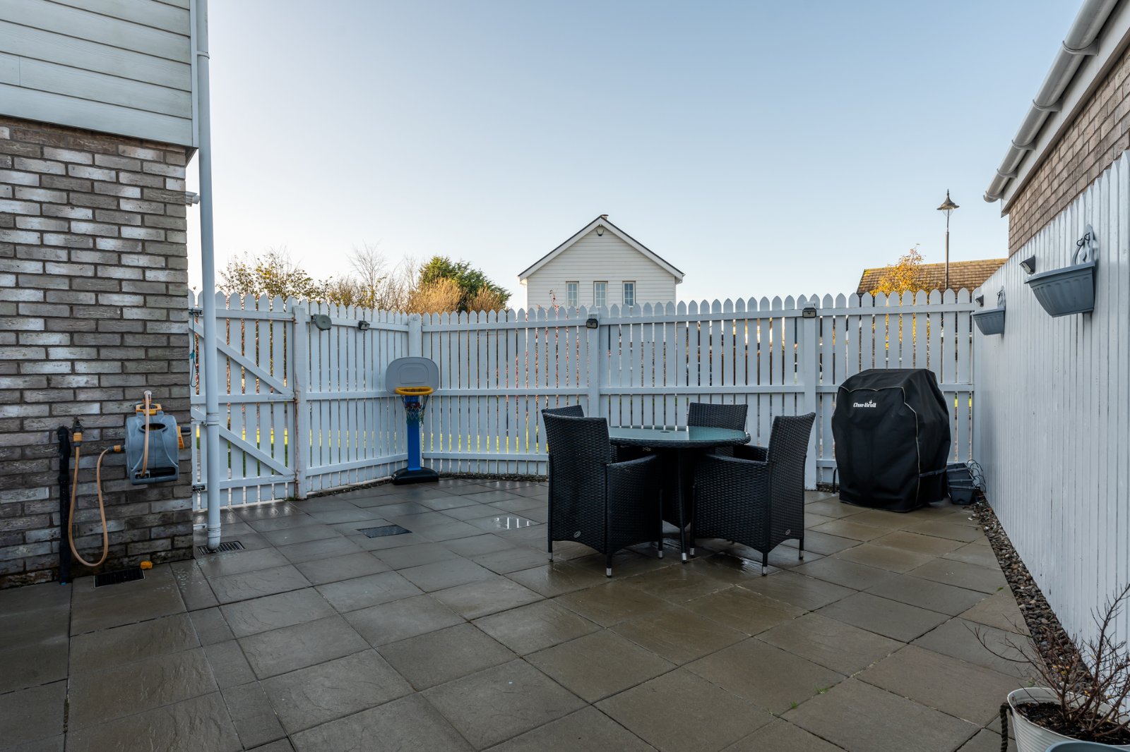 To front, side and rear in lawns, trees, large modern paved patio, fencing, outside light, outside water tap, double width tarmac driveway.