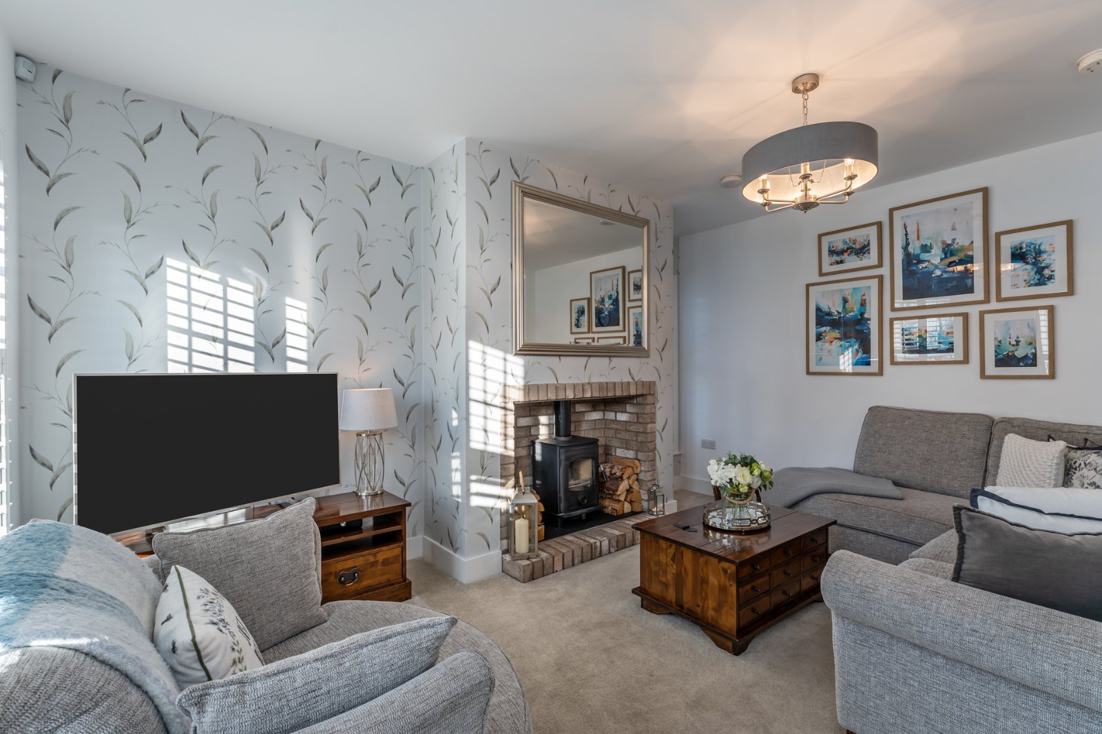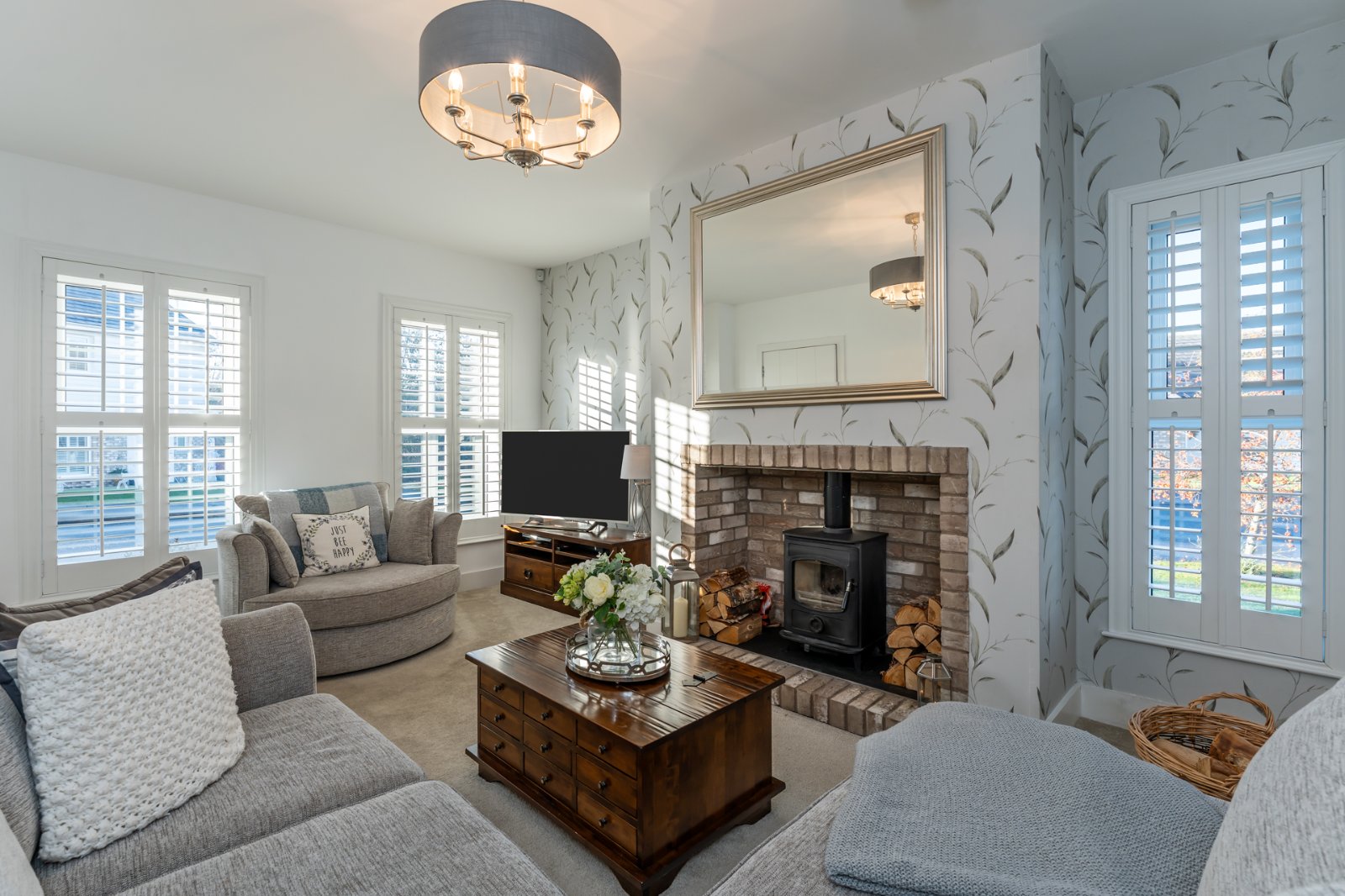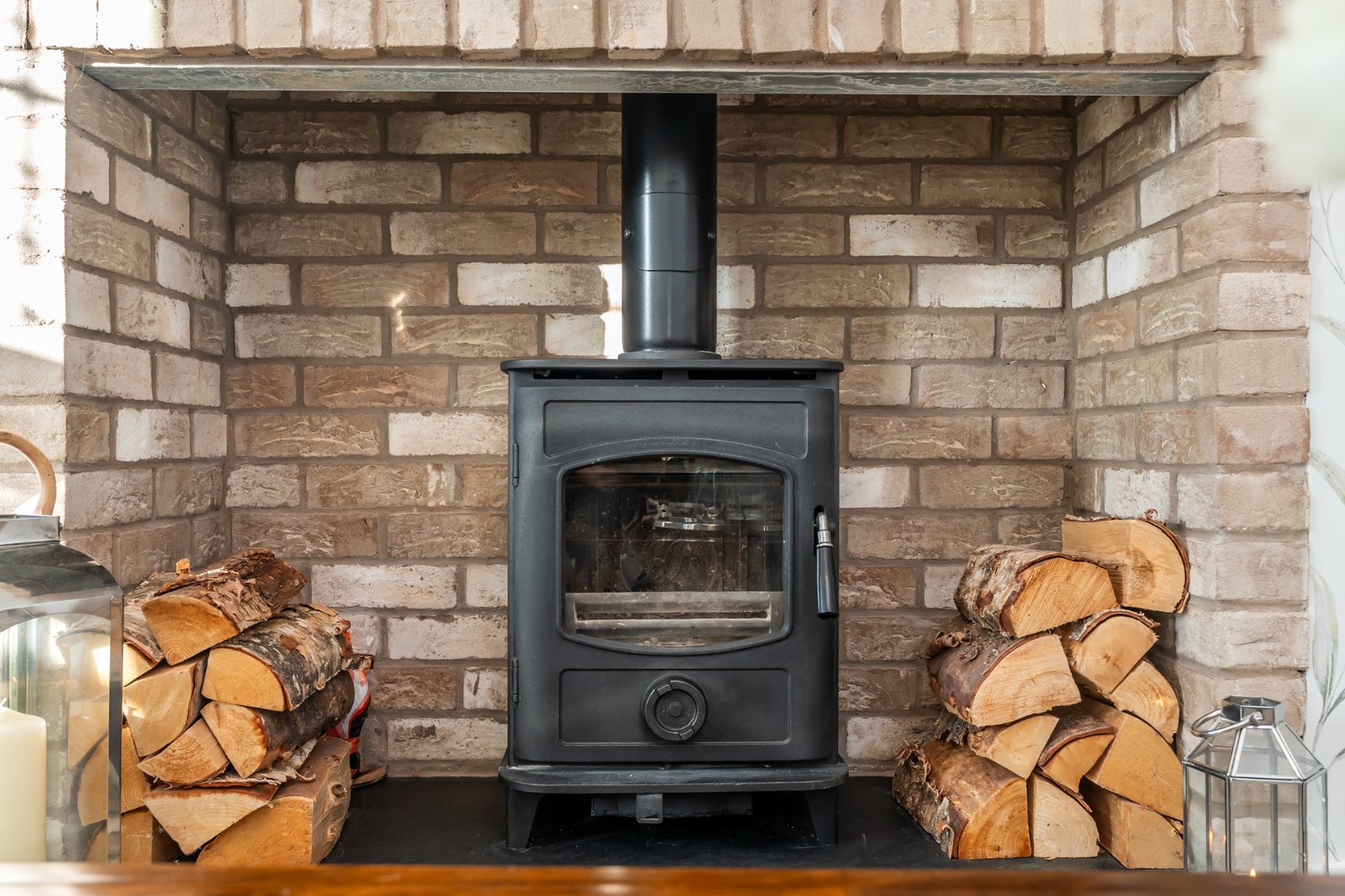 Attractive brick Inglenook style fireplace, wood burning stove, slate hearth, dual aspect, TV points.