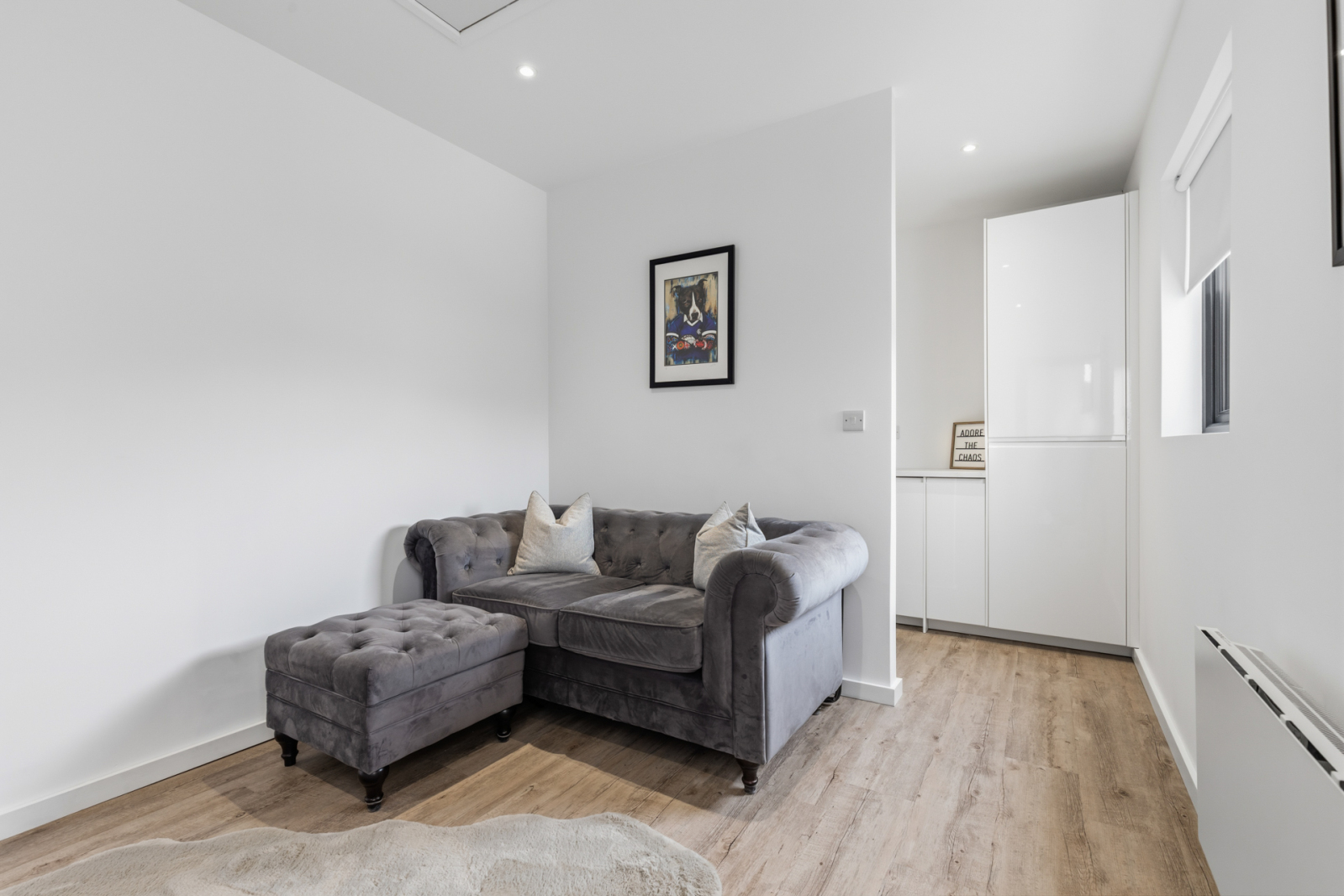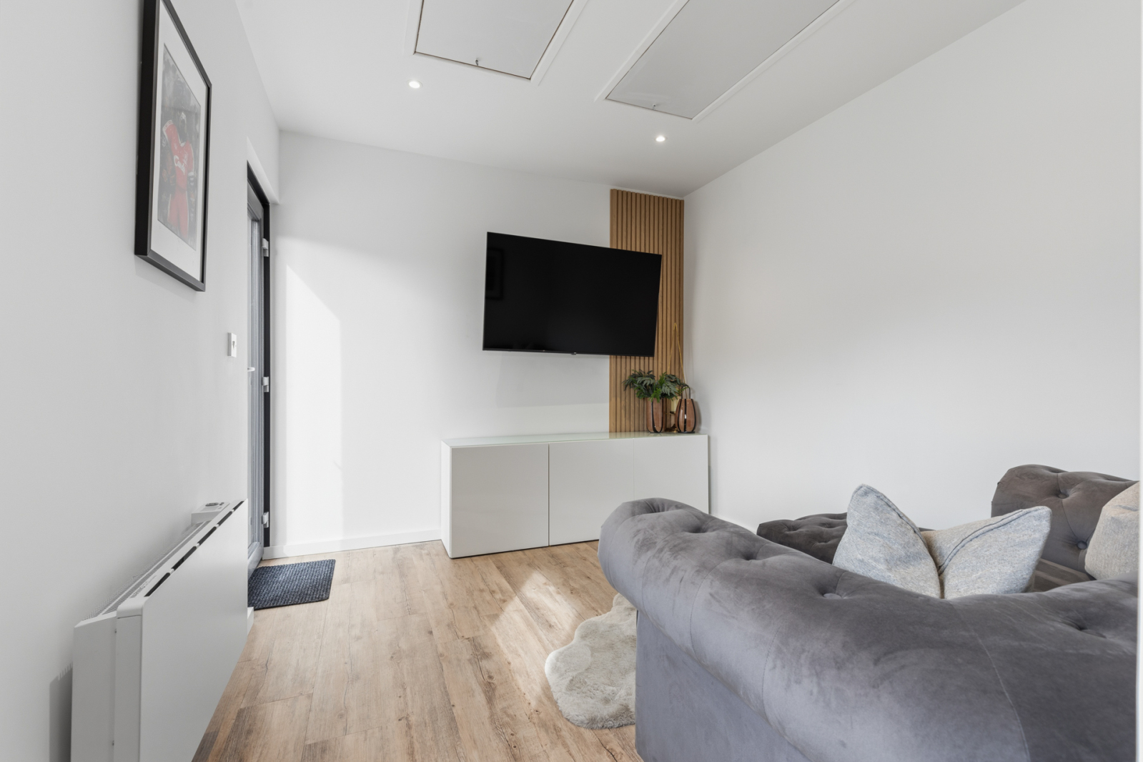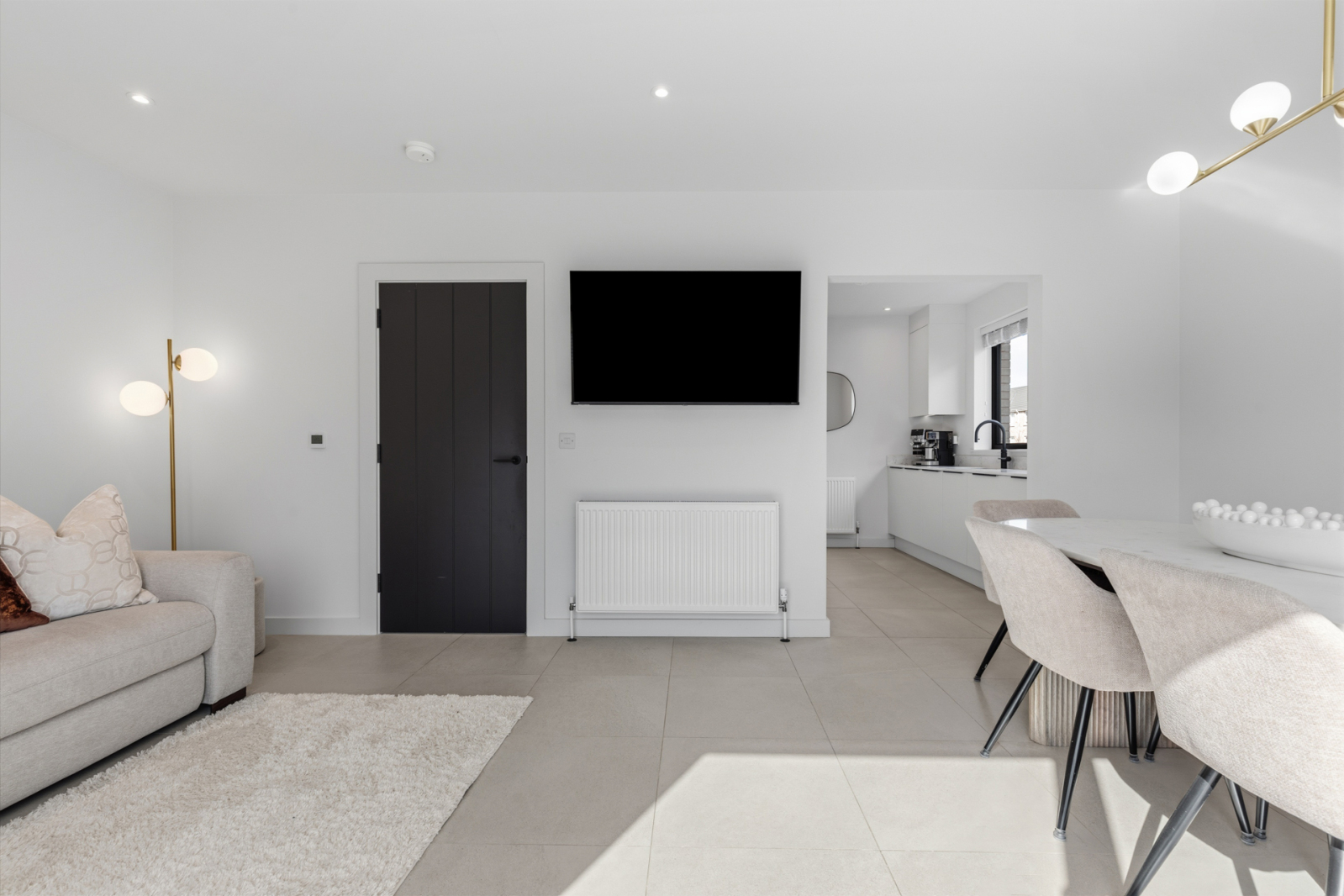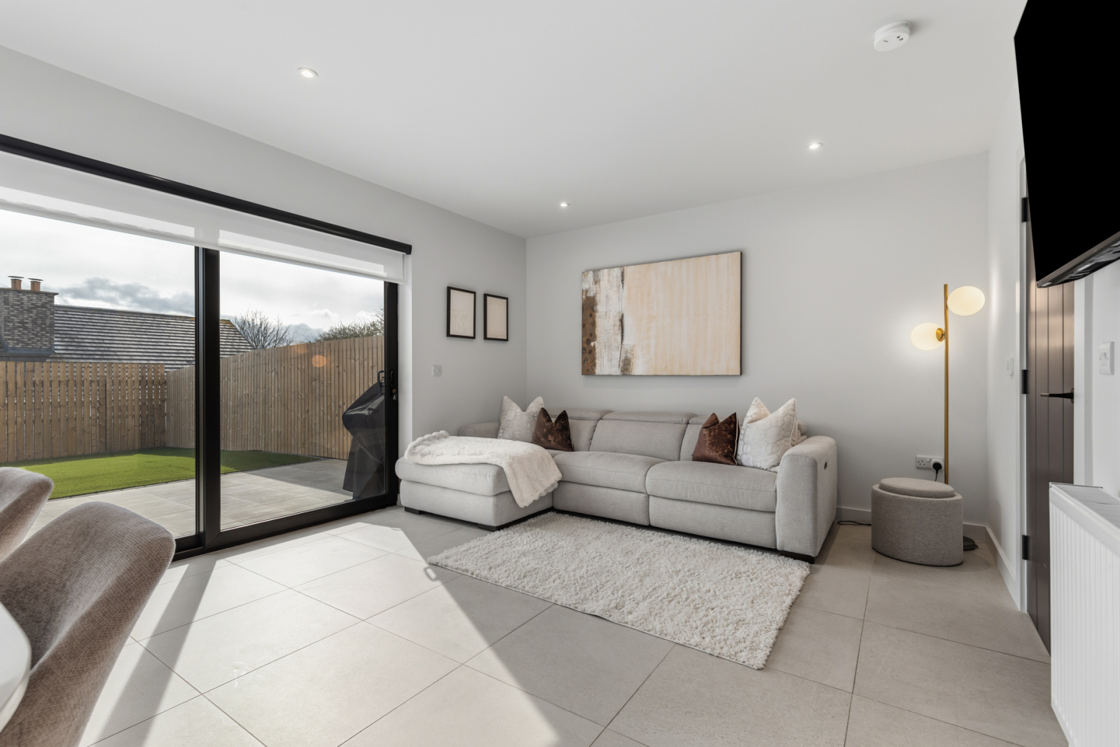 LED recessed spotlighting, ceramic tile floor, wired for wall mounted TV. Dark grey double glazed sliding patio doors leading to rear enclosed garden (south facing).