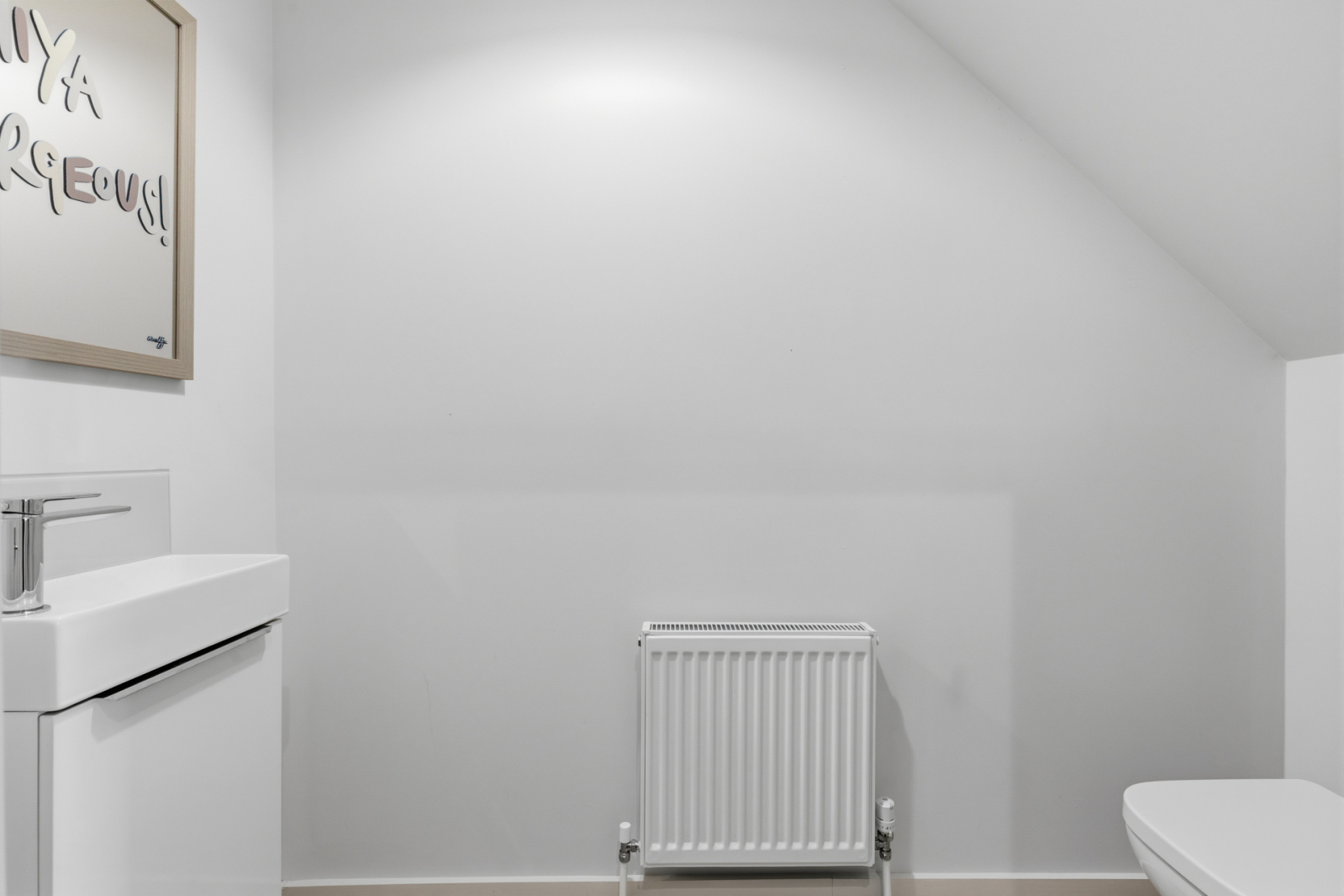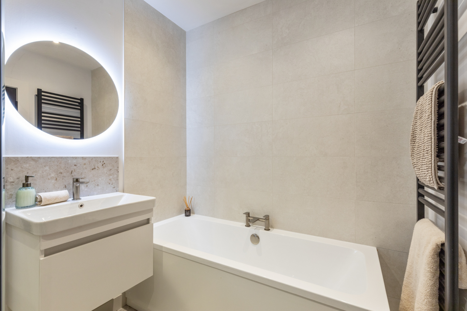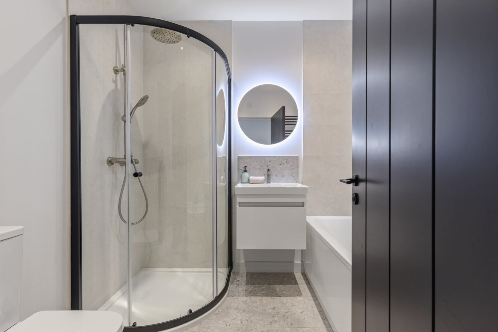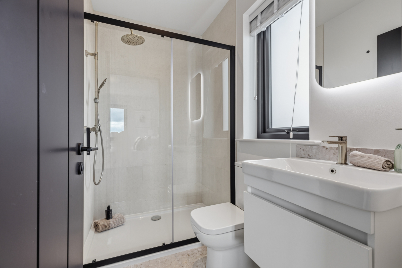 Modern white suite comprising of: large fully tiled shower cubicle with thermostatically controlled shower, rain head and telephone hand shower, modern floating vanity unit, wash basin with mixer taps. Push button WC, wired for electric mirror, black towel radiator. LED recessed spotlighting and extractor fan. Terrazzo style floor tiles.