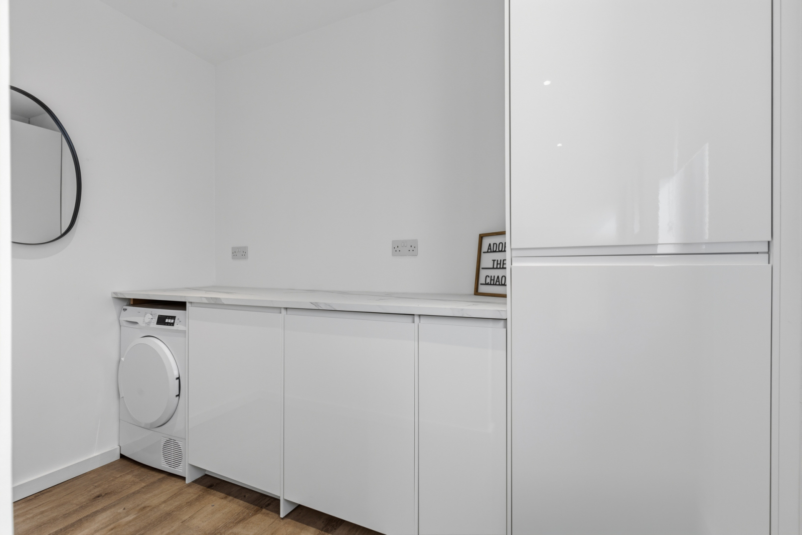 Quartz worktop, modern satin finish units, integrated washer/dryer. LED recessed spotlighting and extractor fan.