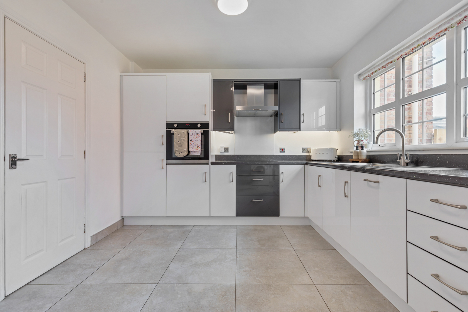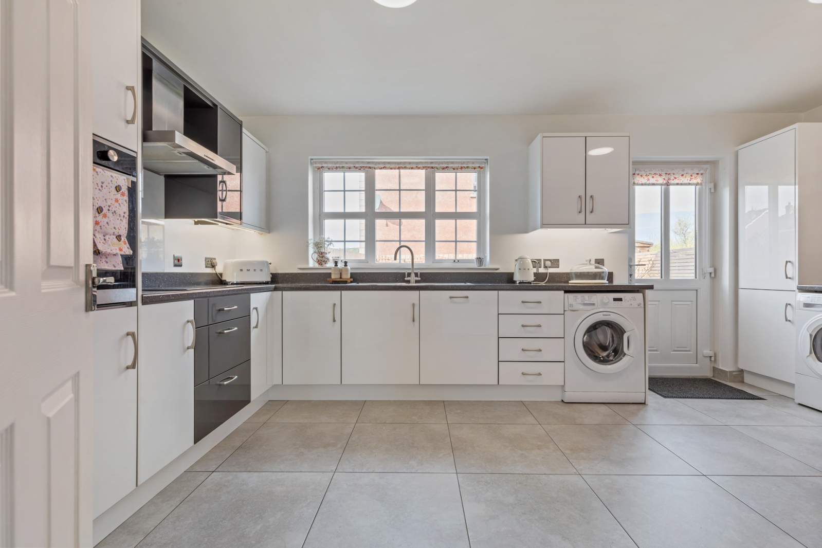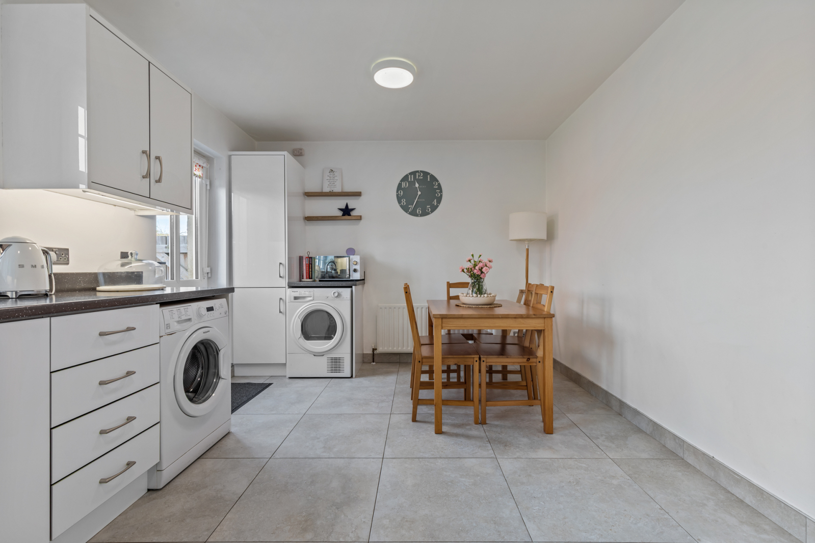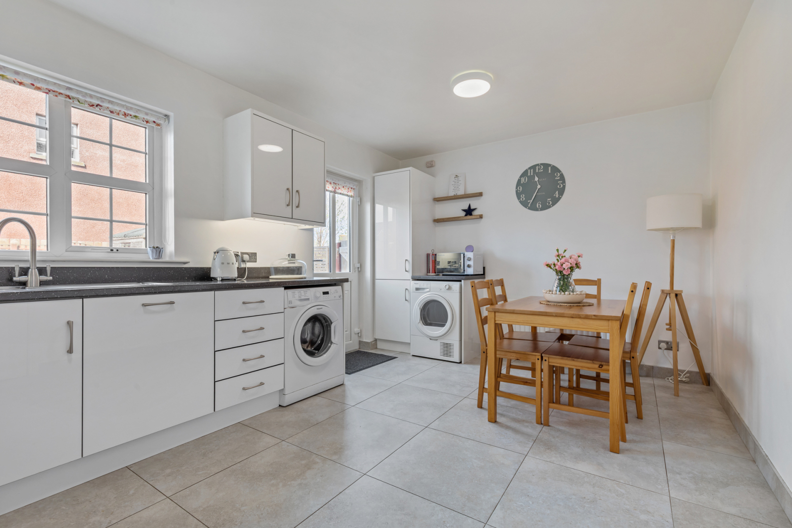 Excellent range of high and low level gloss finish white units, Formica roll edge work surfaces worktop, stainless steel single drainer sink unit with mixer taps. Ceramic hob, stainless steel extractor fan, built in oven, plumbed for washing machine, recess for tumble dryer, integrated fridge freezer. Concealed boiler, ceramic tile floor, dining space. PVC door to rear