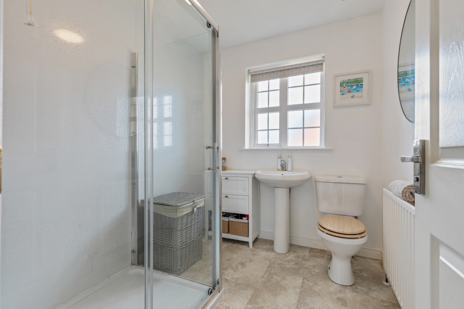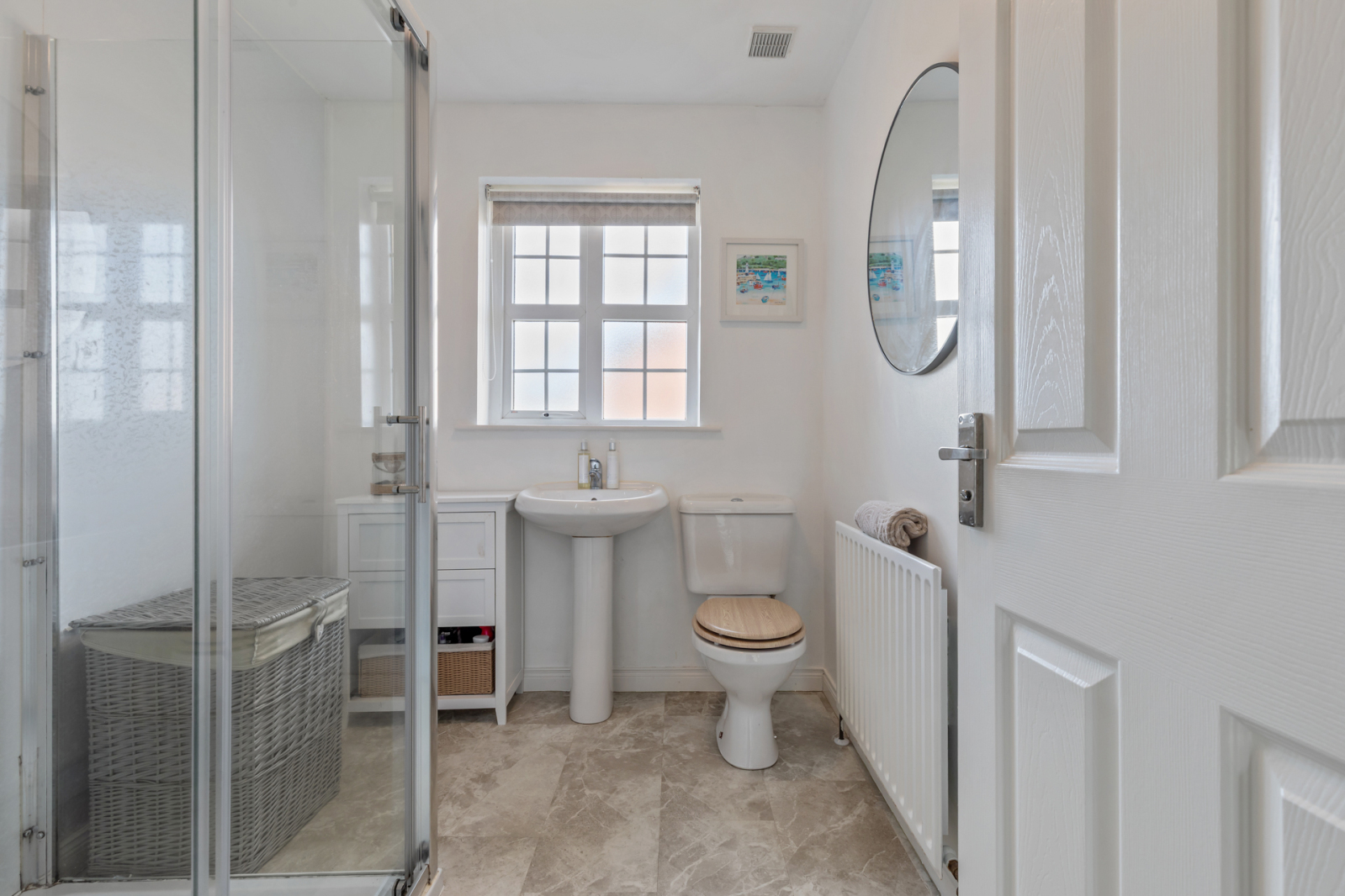 Modern white suite, separate shower cubicle, thermostatically controlled shower with telephone hand shower, pedestal with wash hand basin and mixer taps, push button WC and extractor fan