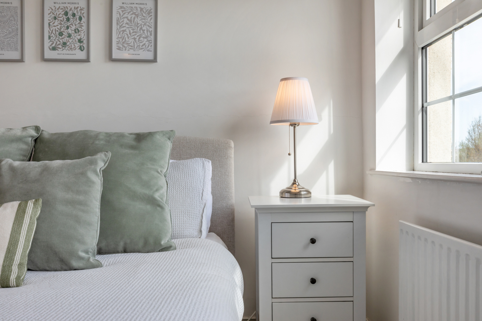 Polished laminated floor, television point, telephone point, painted timber fireplace with mantle and surround, open fire with slate tile hearth. Concealed under stair storage