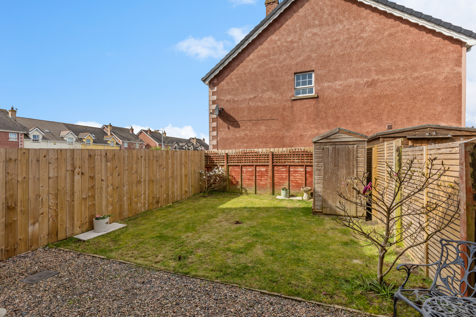 Fully enclosed laid in lawn and gravel patio, outside tap and outside light. Access to side for bins