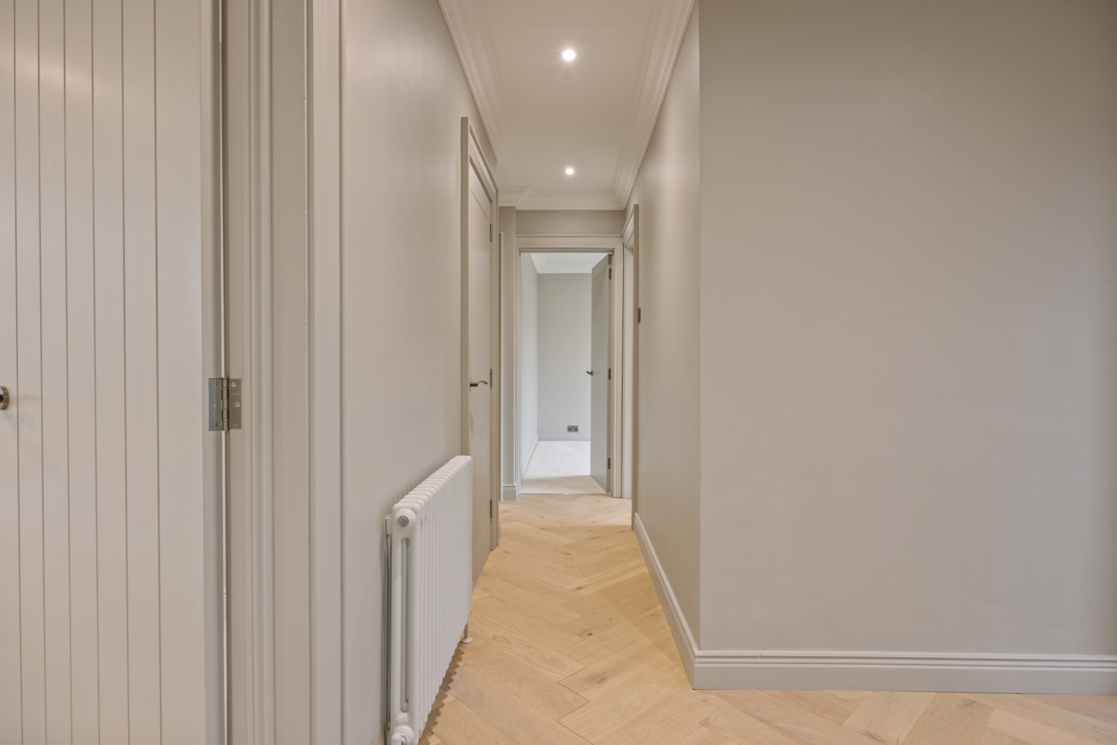 Solid hardwood herringbone flooring, storage cupboard, cornice ceiling, access to roof space.