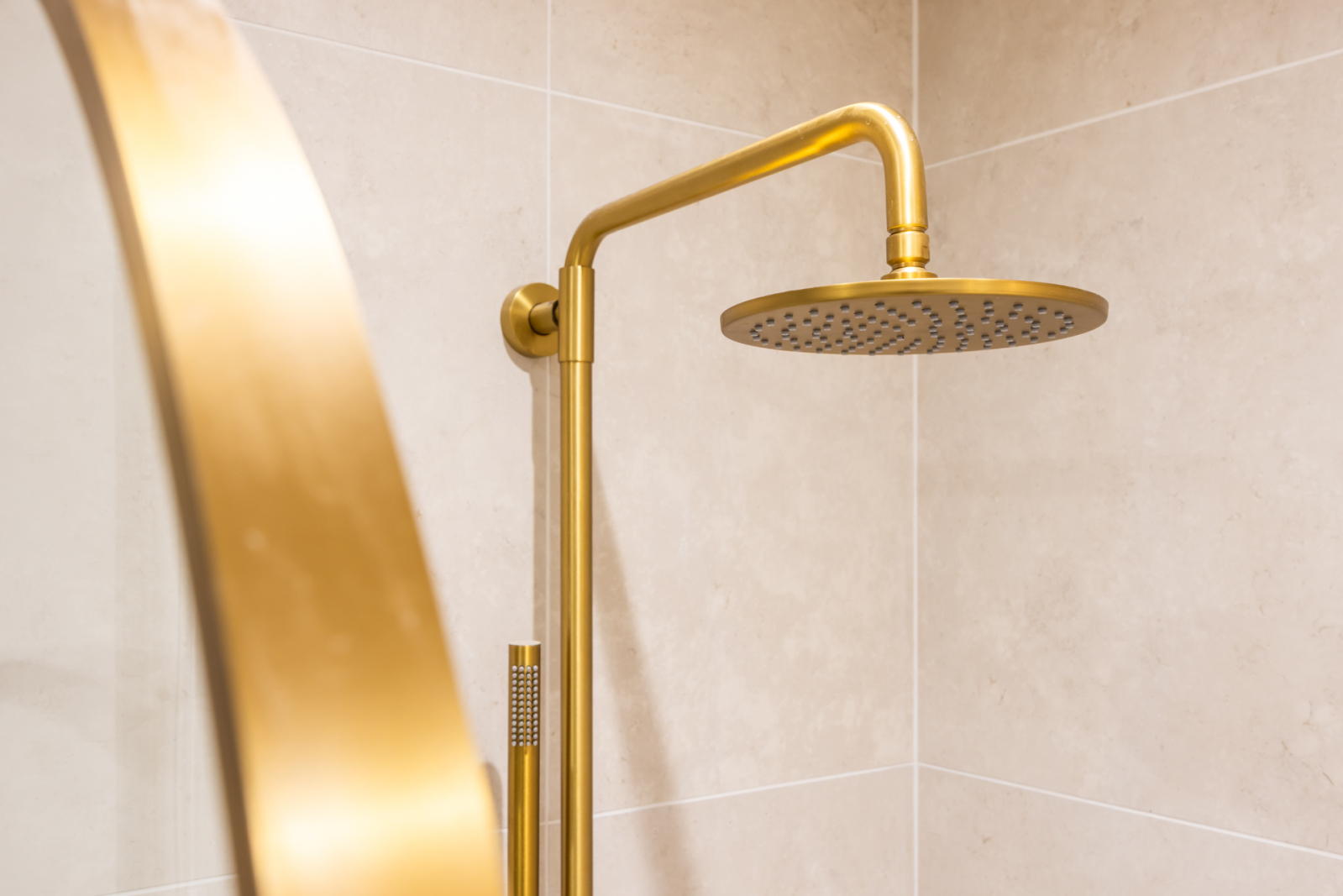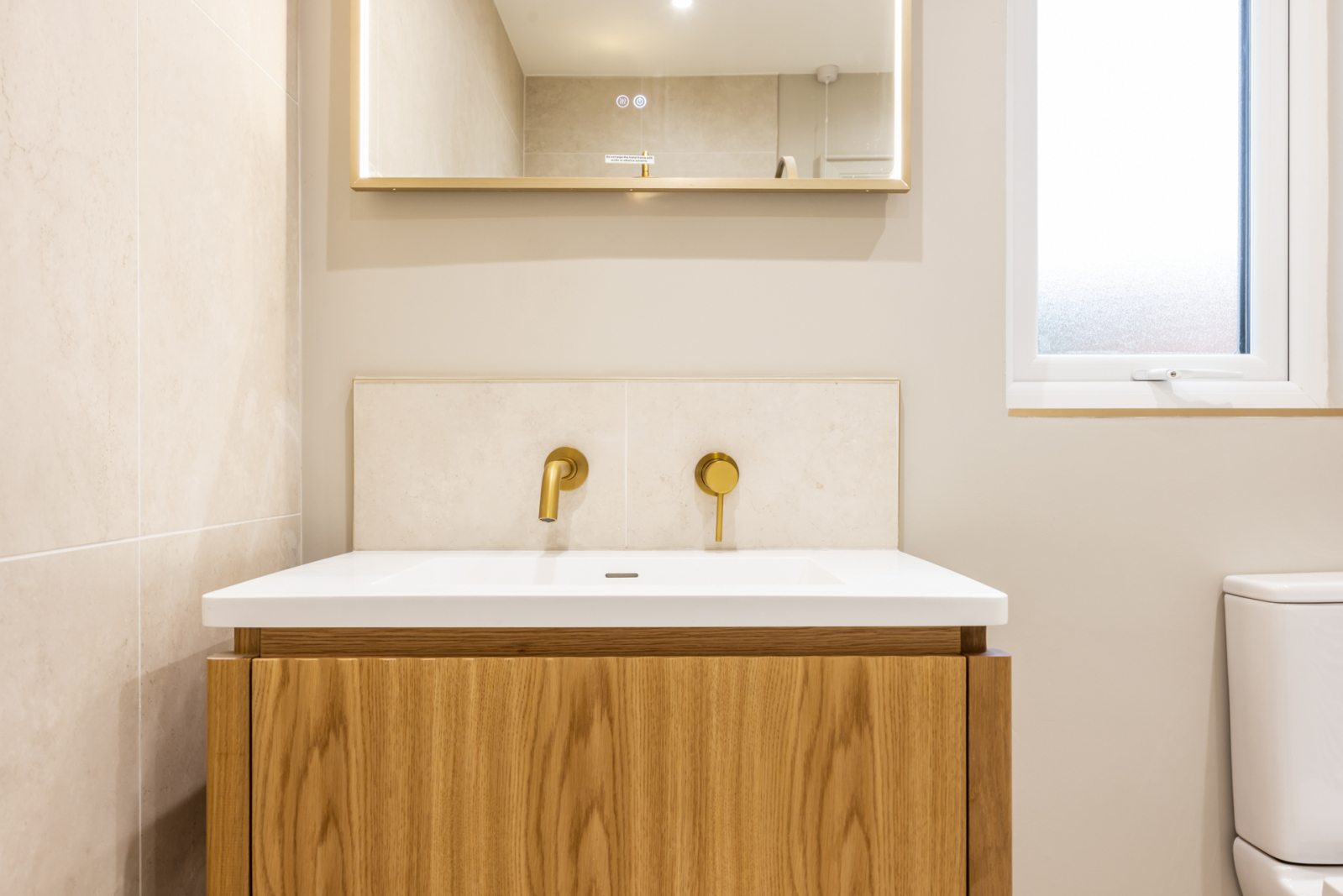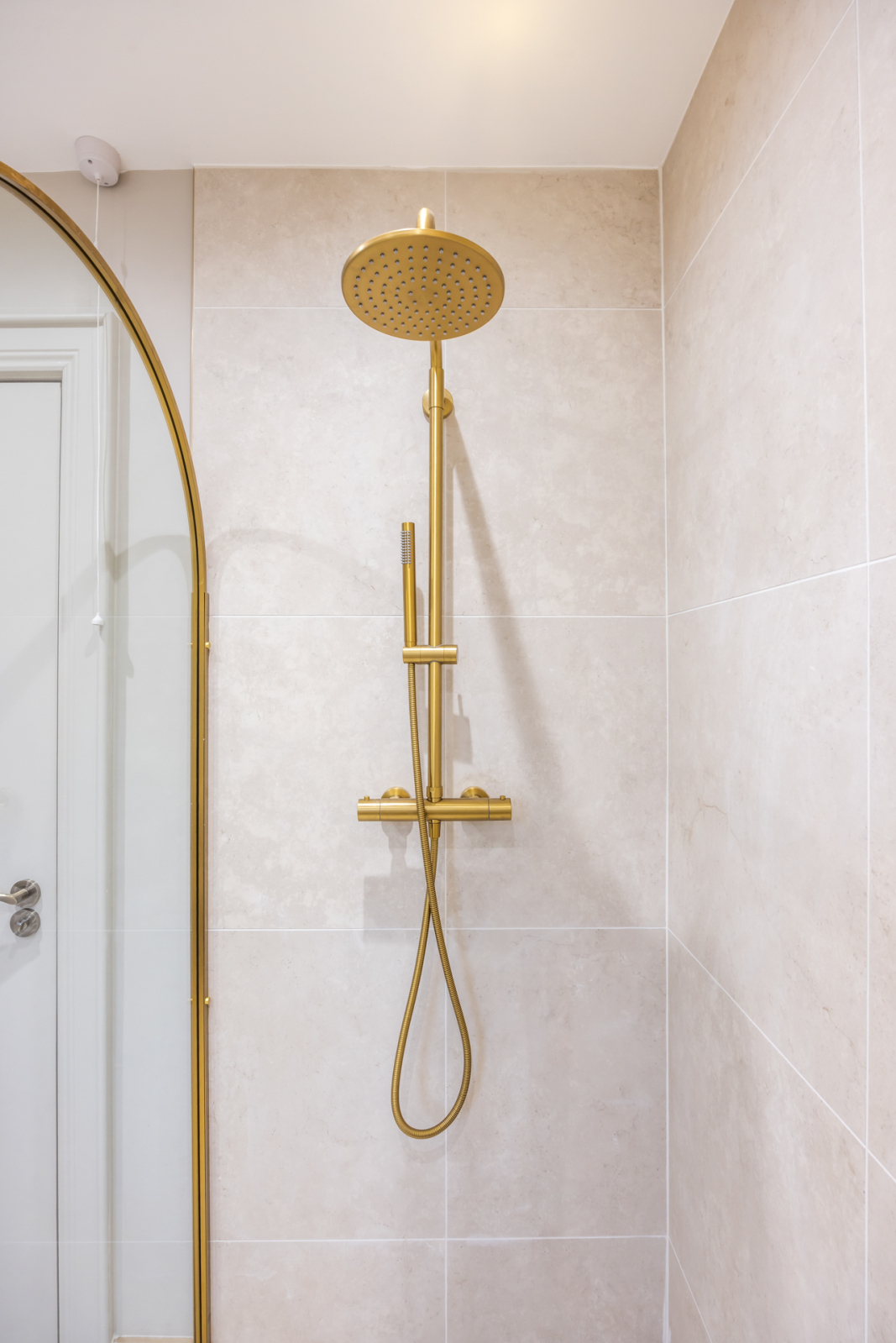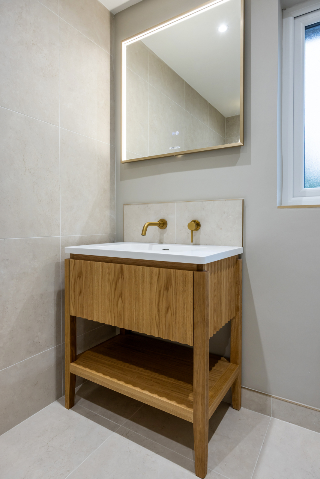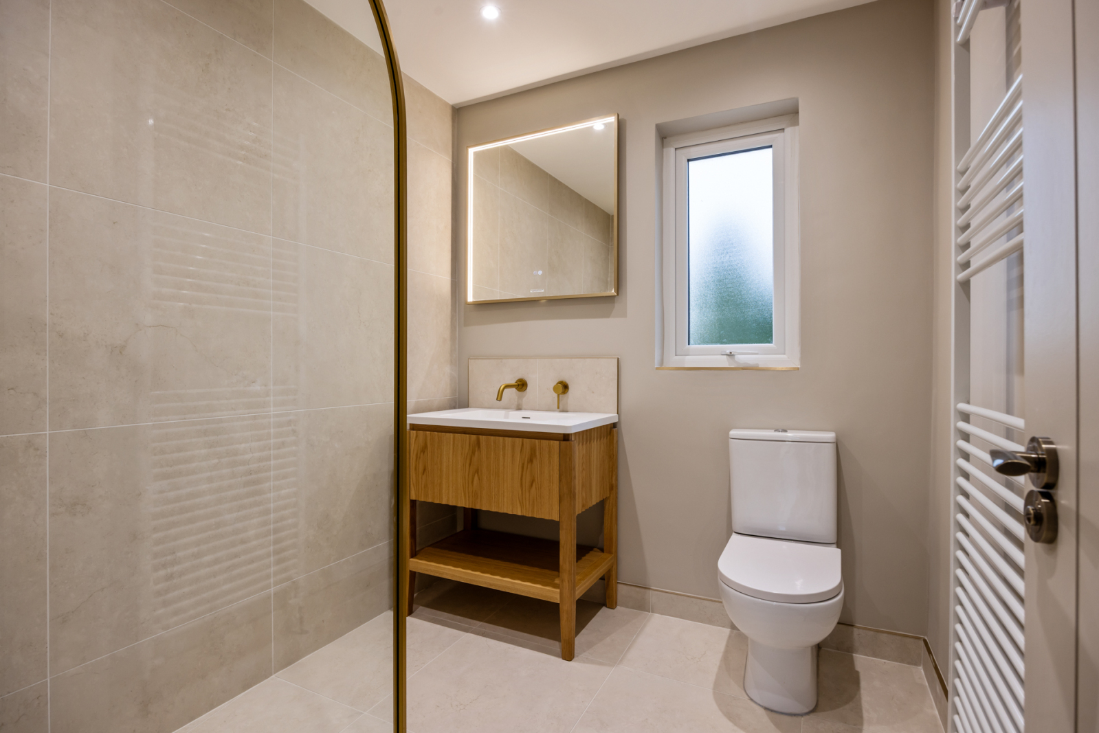 White suite comprising of low flush WC, wash hand basin with mixer tap, storage below, walk-in thermostatically controlled shower with rainfall shower head, handset, recessed spotlighting, partly tiled walls, tiled flooring, vertical heated towel rail.