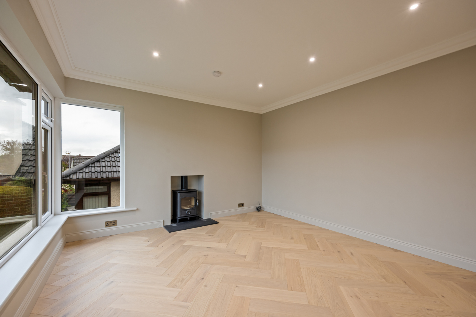 Recessed spotlighting, cornice ceiling, solid hardwood herringbone flooring, hole in the wall fireplace with cast iron multi fuel burning stove, slate hearth.