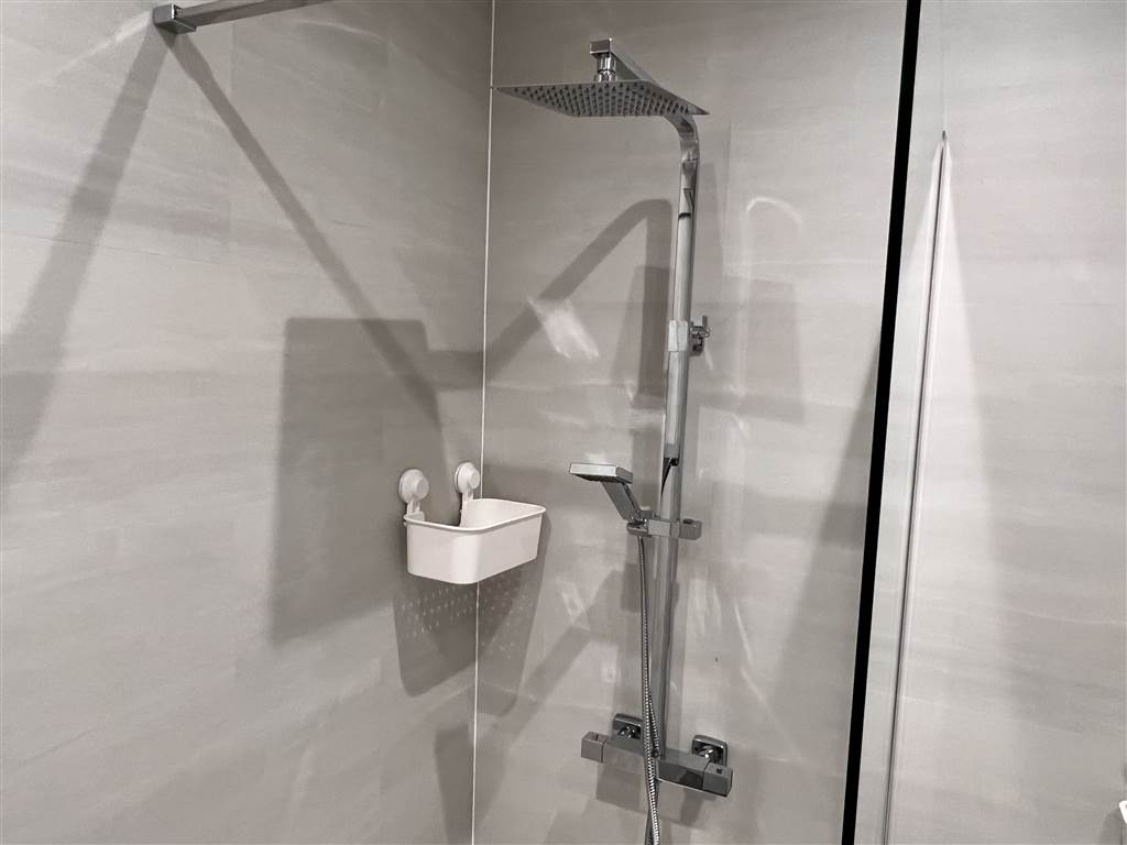 Upstairs shower room in white suite with glazed enclosure and separate thermostatic rainwater shower and regular shower heads