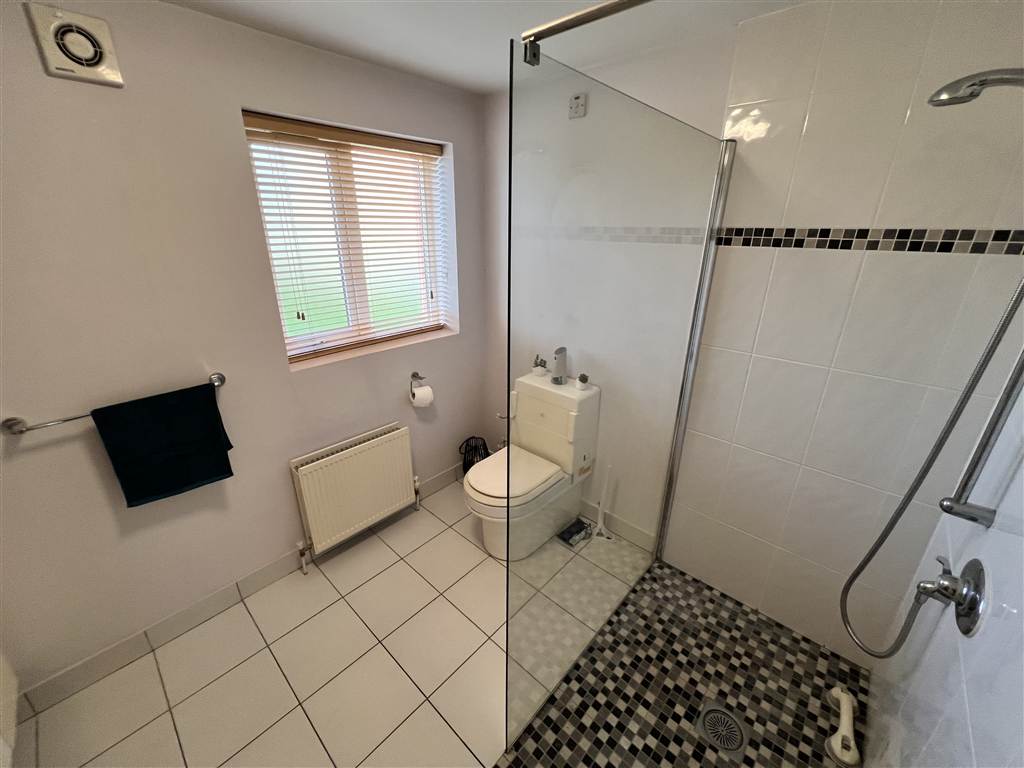 Bathroom in white suite with spacious walk-in shower and raised specialist toilet