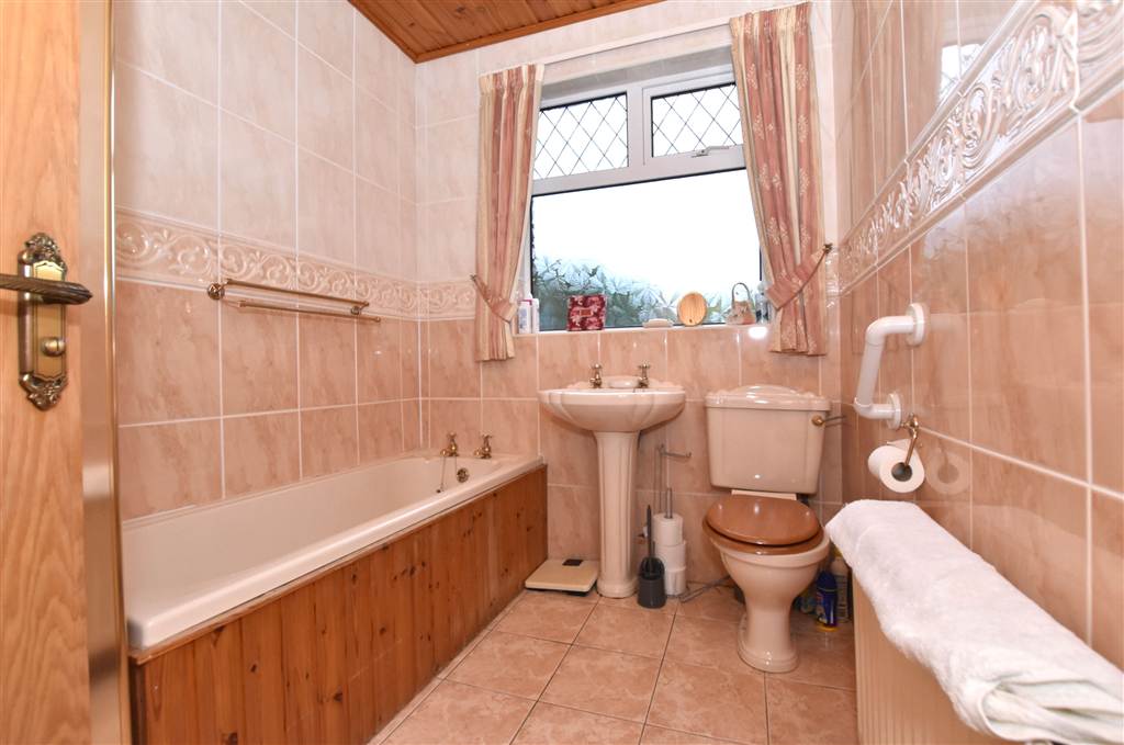 Bathroom suite in cream with wc, wash hand basin on pedestal, bath and shower in cubicle. The floor and walls are tiled and there is a frosted glass window to the rear of the property.