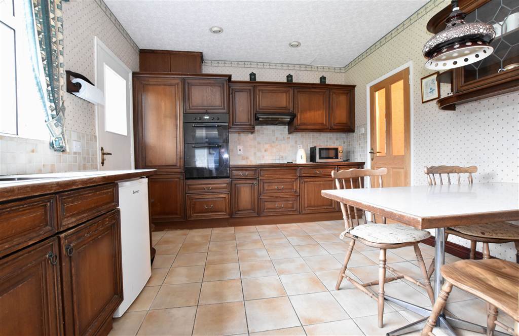 Fitted kitchen with a good range of high and low level units. Integrated double oven, ceramic hob and fitted dining table. There is space for an under counter fridge and freezer, tiled floor, partially tiled walls and spotlights on the ceiling. Overlooking the back garden there is a one and a half stainless steel sink with mixer tap. Before heading out to the back of the property there is a rear porch area.