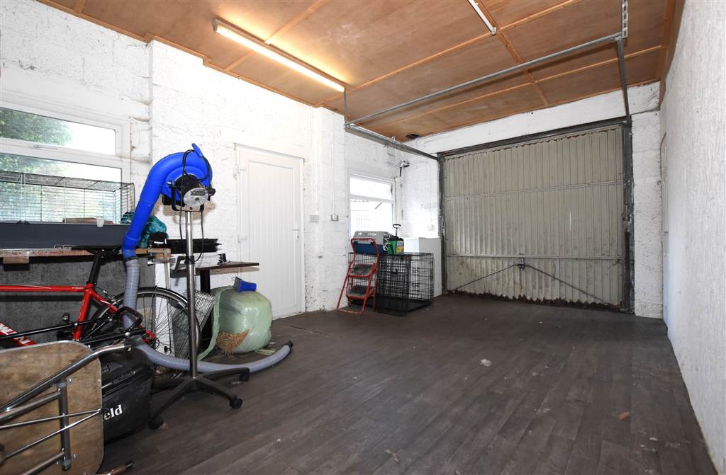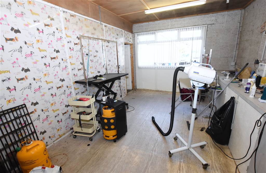 Garage split into two sections with one being the traditional garage with garage door and the other part was used as a dog grooming business.