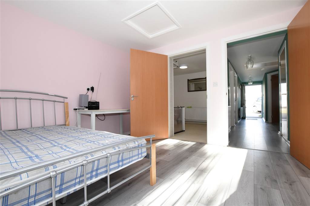Large bedroom with laminate flooring, upvc patio doors to the exterior and an adjoining mobility friendly shower room.