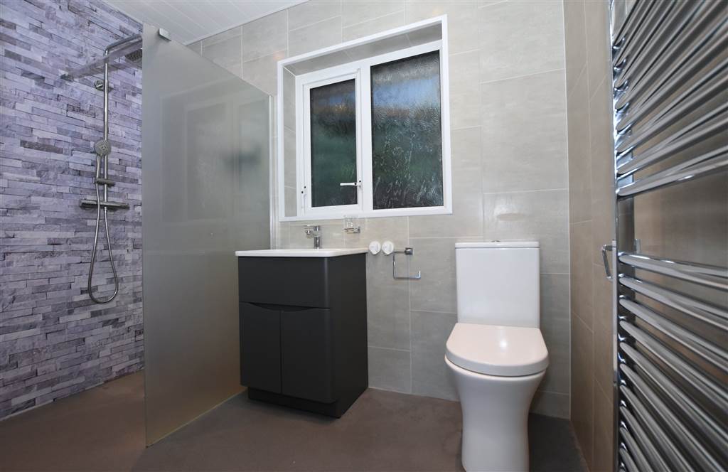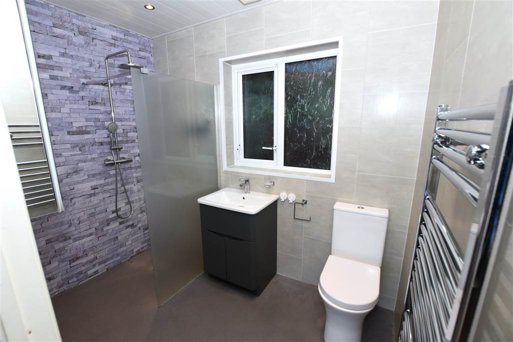 Modern wet/shower room with chrome towel rail radiator, tiled floor and walls, shower with shower screen, wash hand basin on storage cupboard with chrome mixer tap, close coupled push button wc and spotlights on the ceiling with an extractor fan and frosted glass window to the exterior.