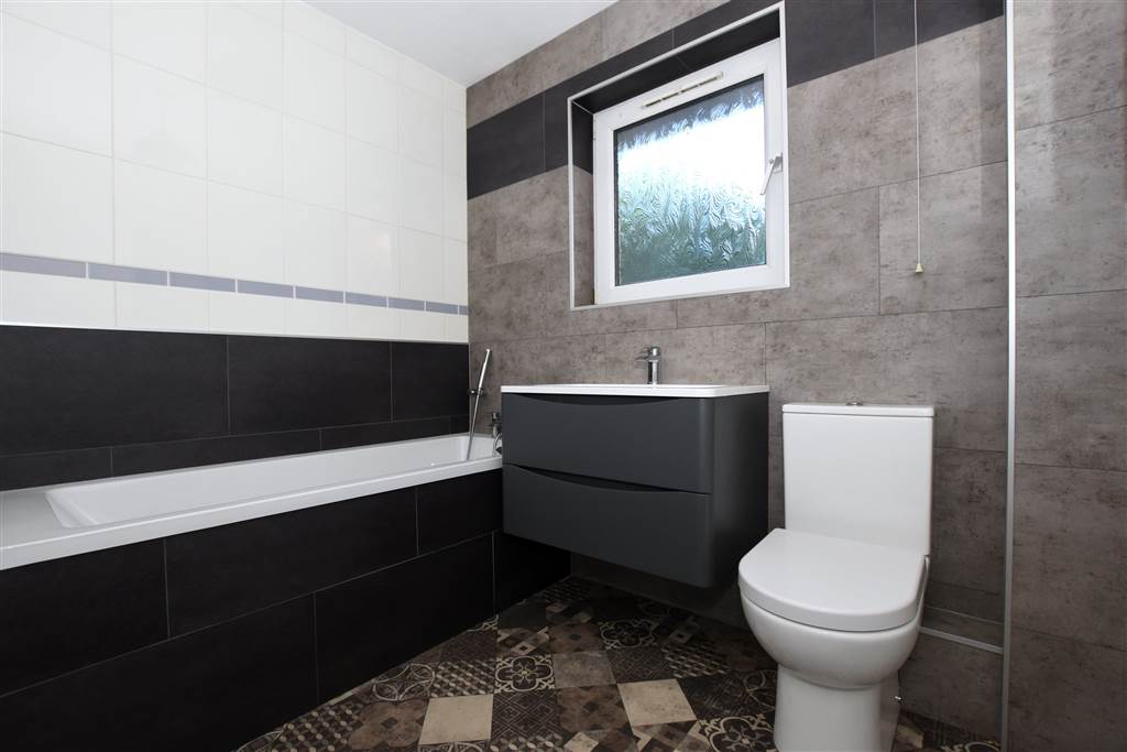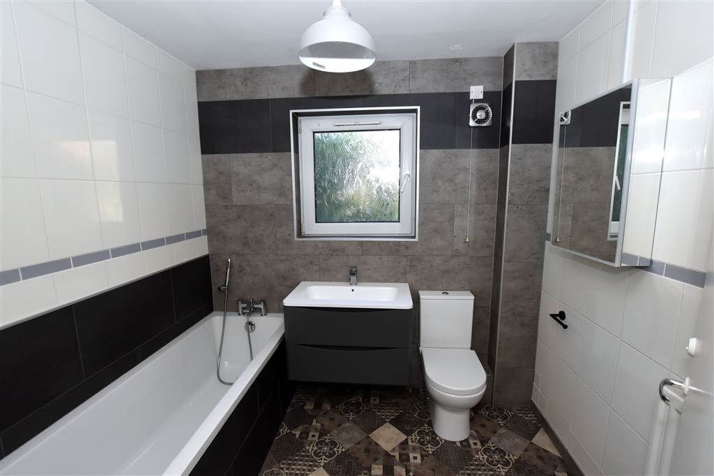 Stylish bathroom with hand held shower over bath, wash hand basin on storage cupboard with chrome mixer tap, close coupled push button wc, extractor fan, mirrored cabinet on wall and frosted glass window to exterior.