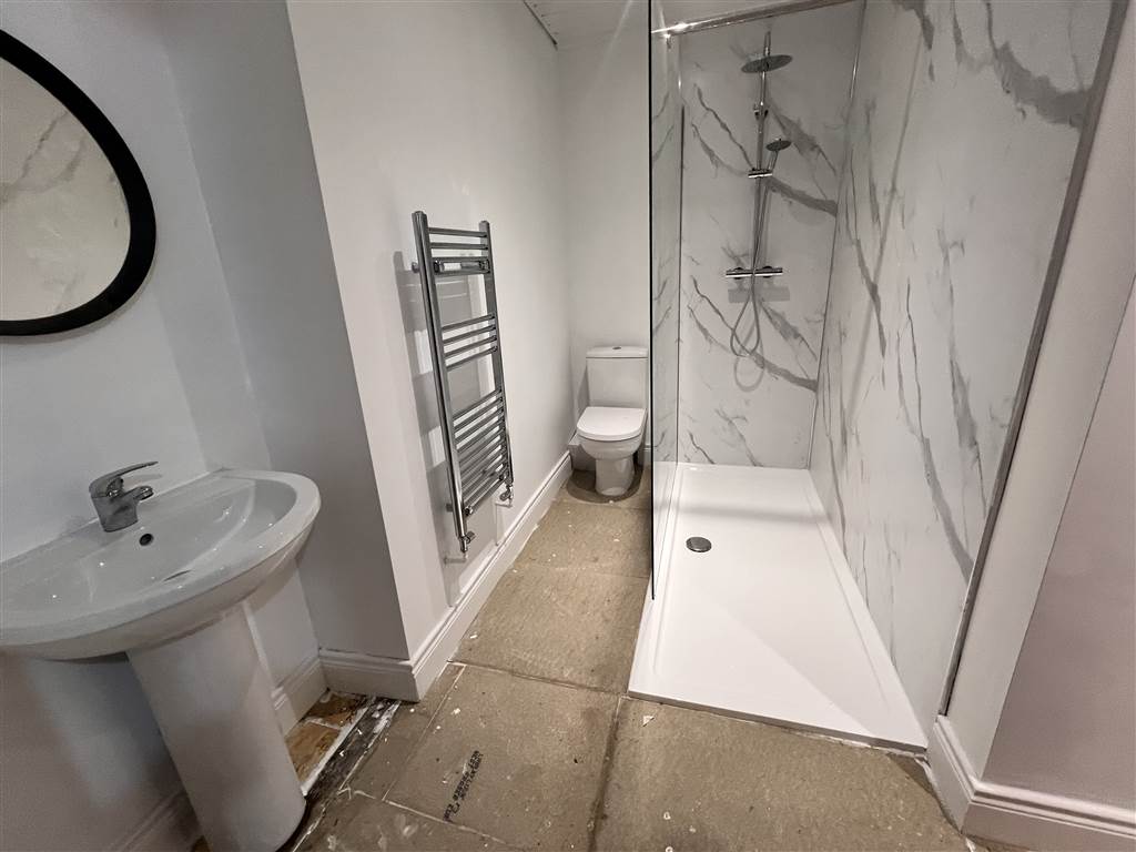 Luxurious new shower room in white suite with extra long shower tray, panel walls c/w rainwater and handheld shower heads, wc and wash hand basin