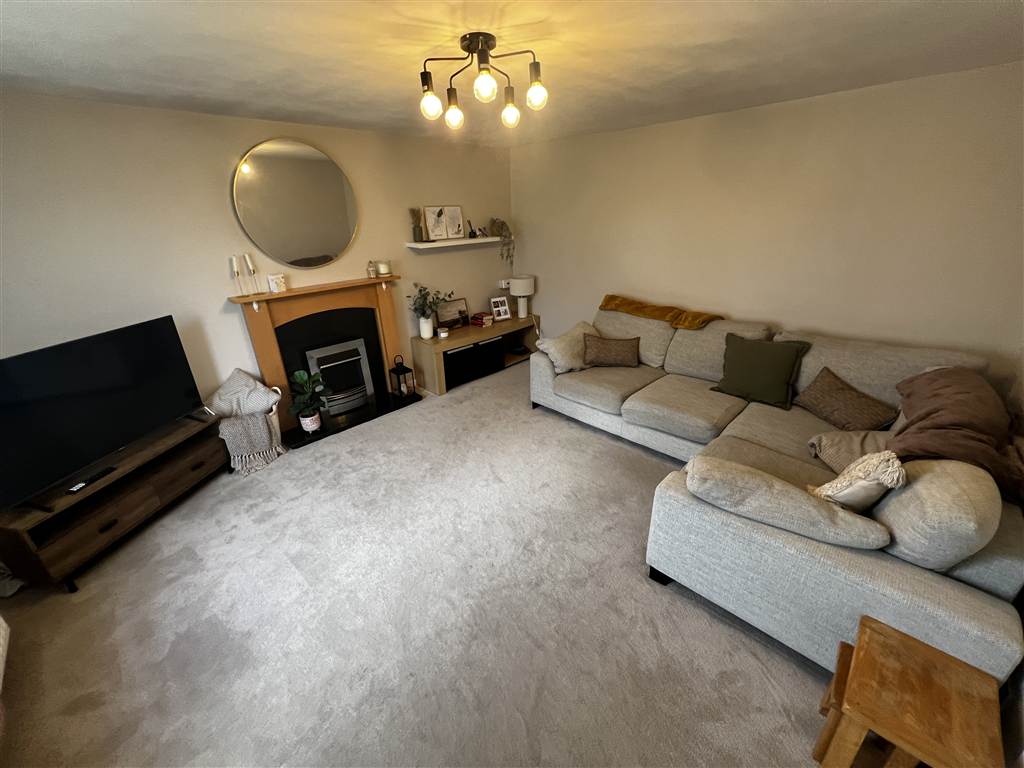 Large spacious lounge room with an electric inset fireplace with wooden surround and carpeted floor