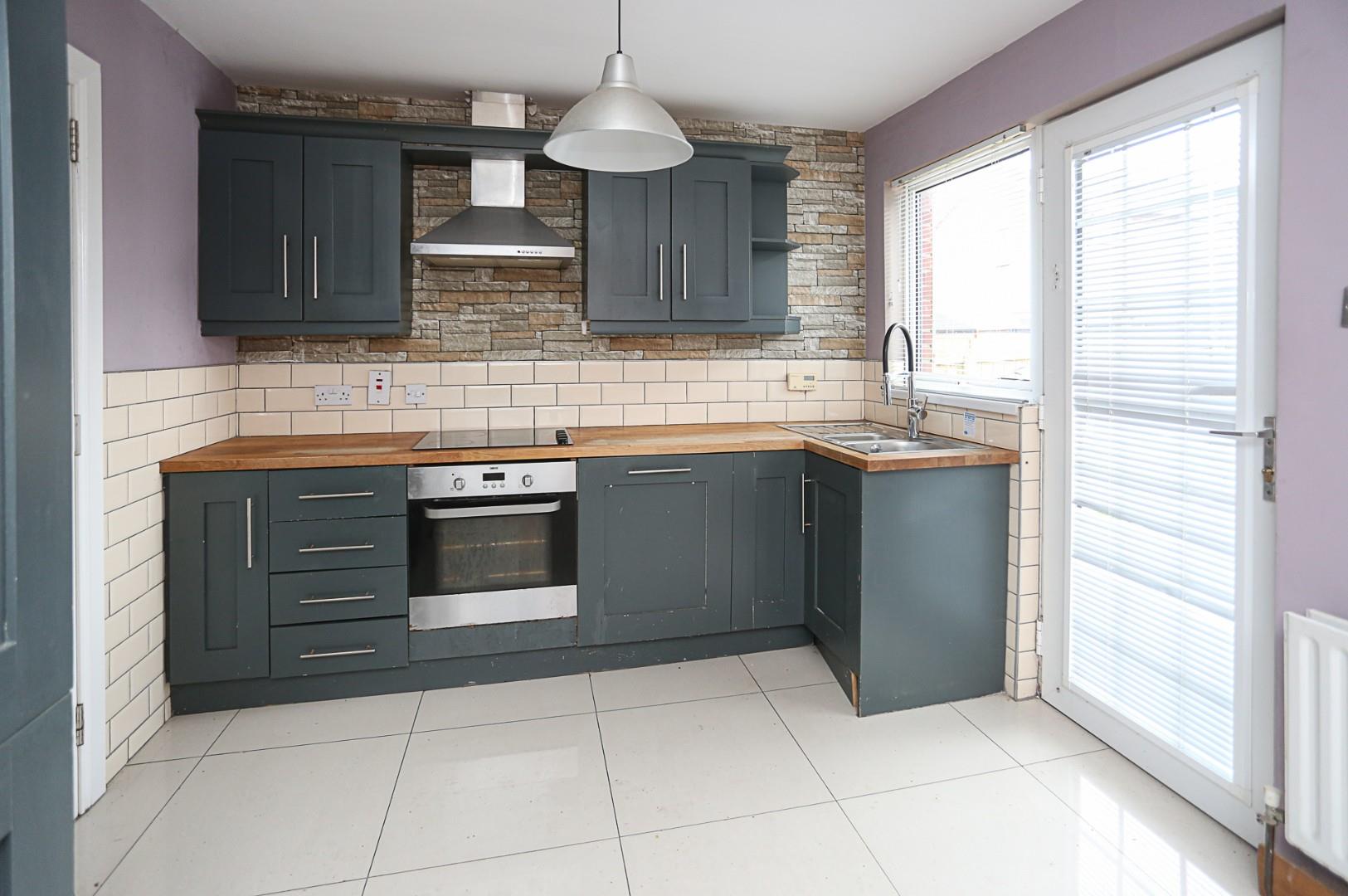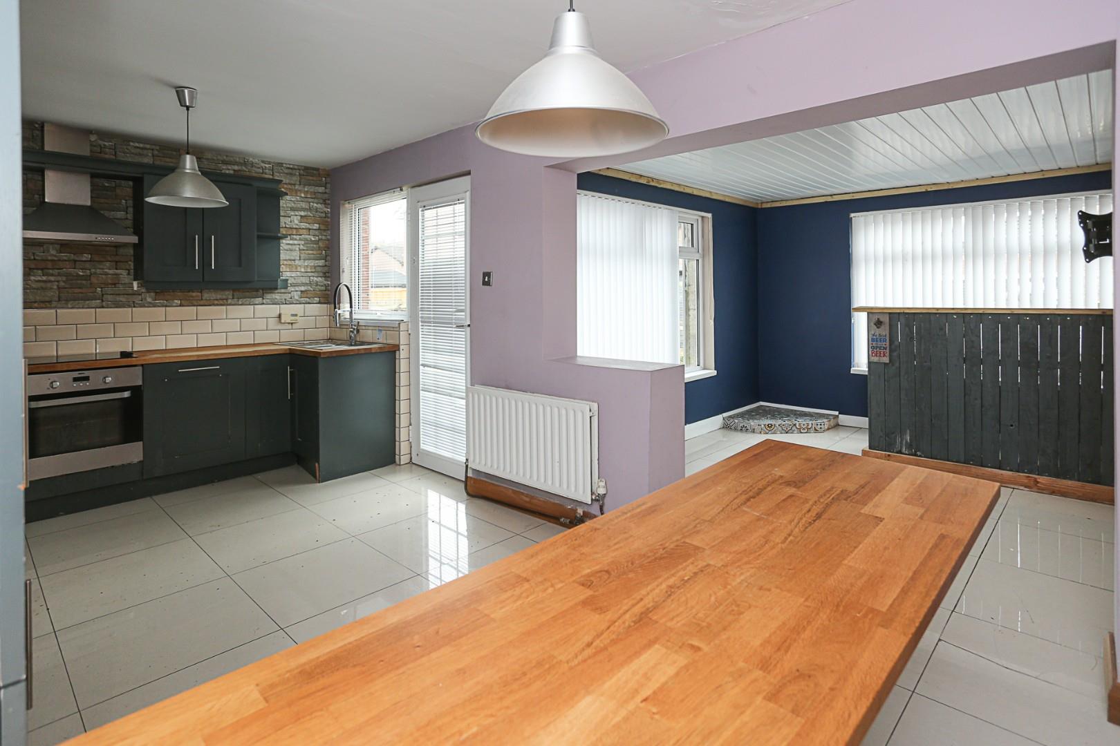 High and low level units, one and half bowl stainless steel sink unit with mixer tap, four ring ceramic hob, stainless steel extractor, electric under oven, breakfast bar, part tiled walls, tiled floor, pvc door to rear garden, open plan through to .....